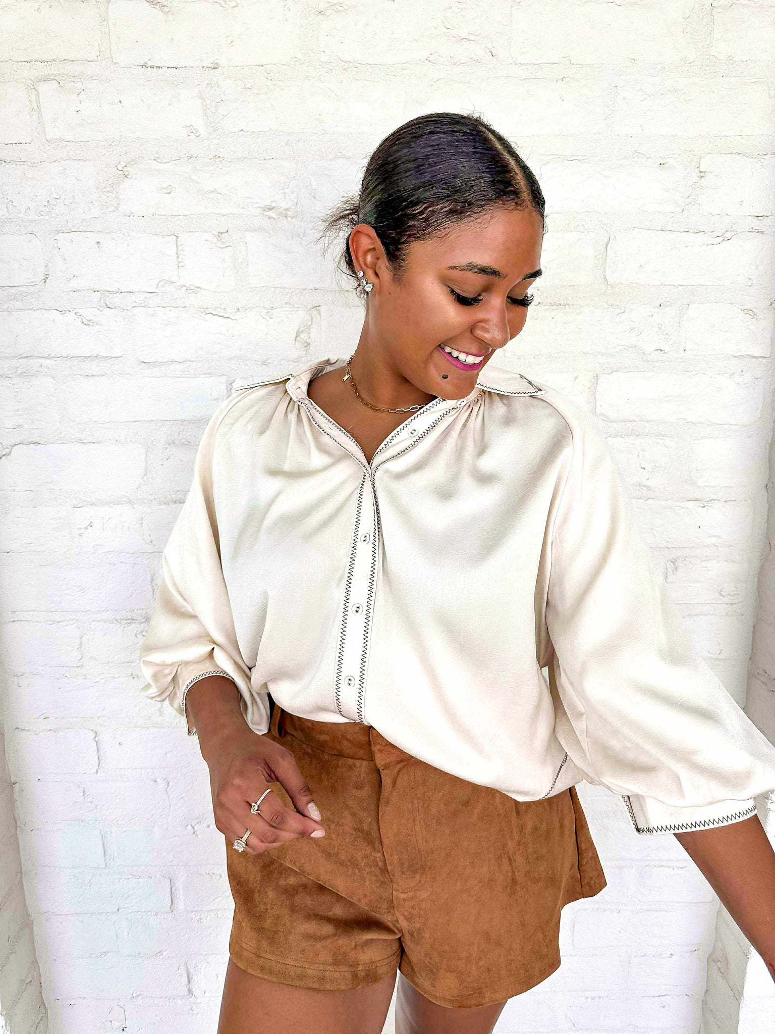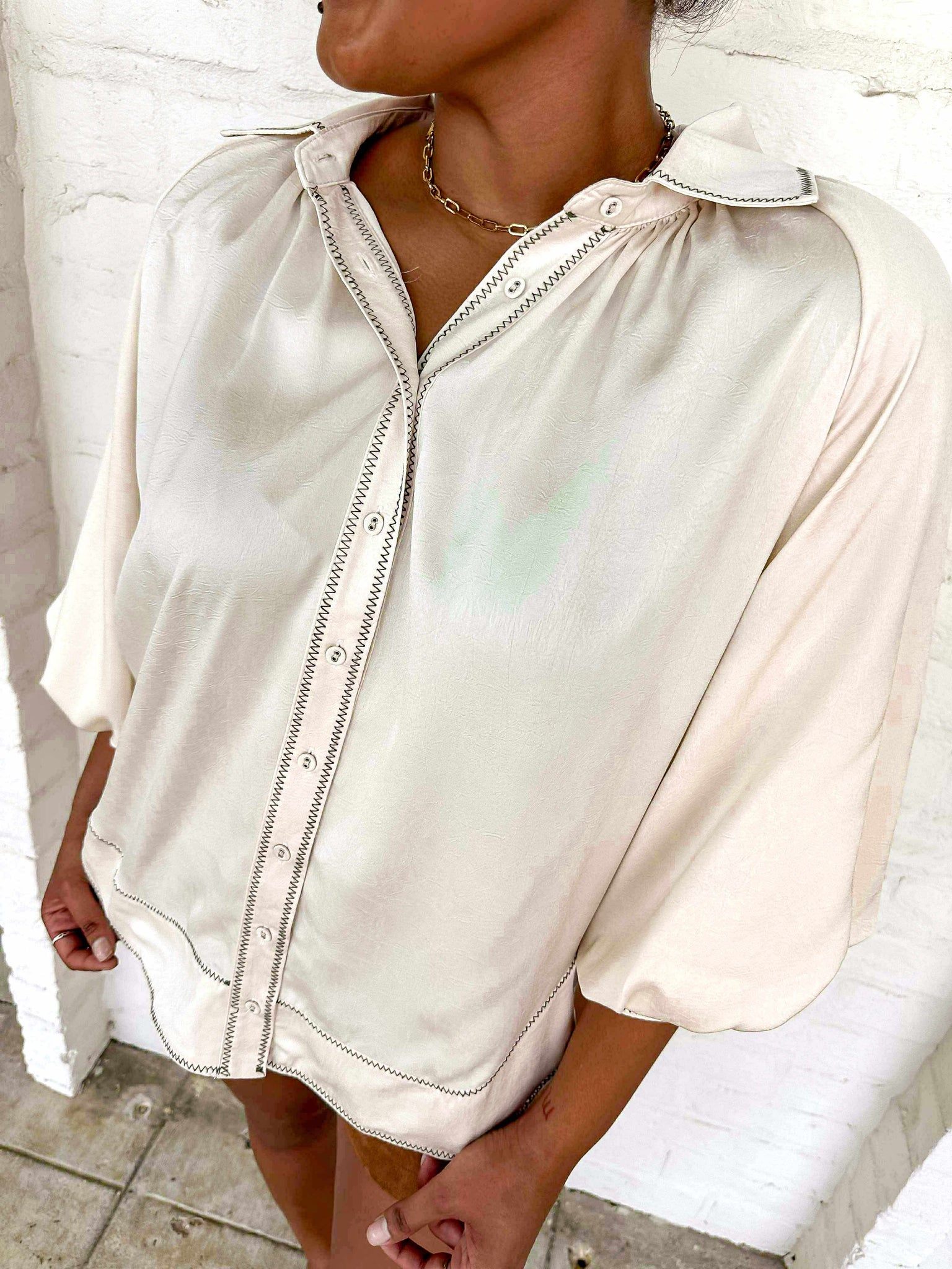 Elevate your style with our Enough Talking Cream Top. This silky blouse will leave you feeling confident and stylish. Say goodbye to boring tops and hello to effortless elegance!