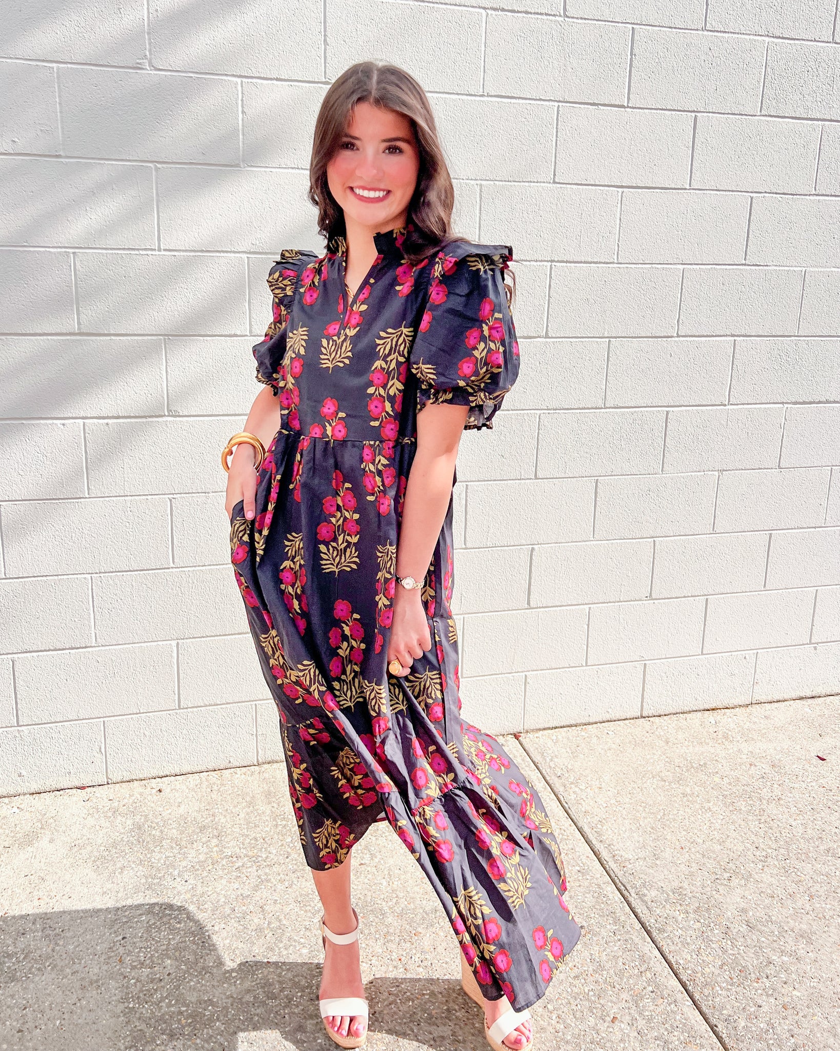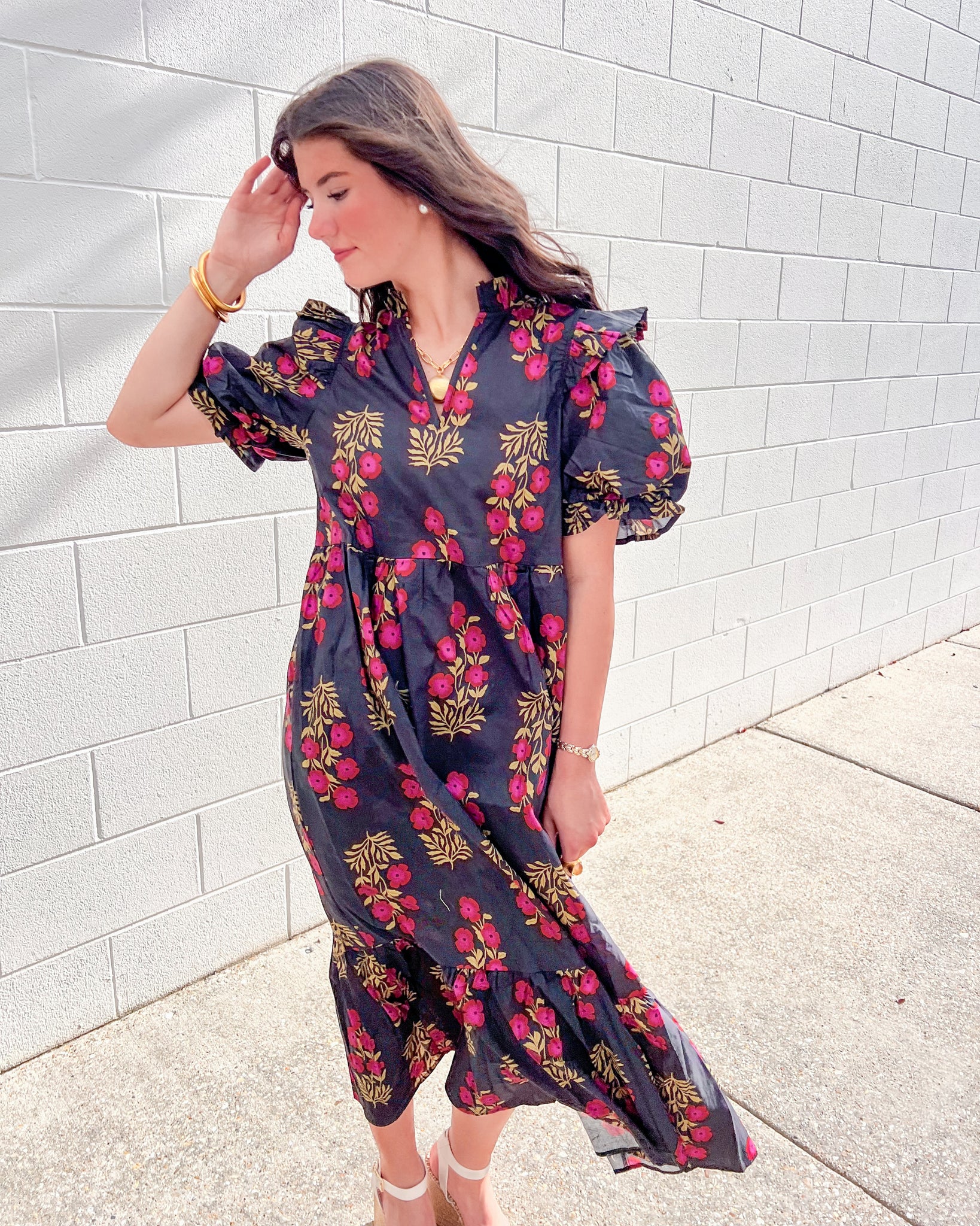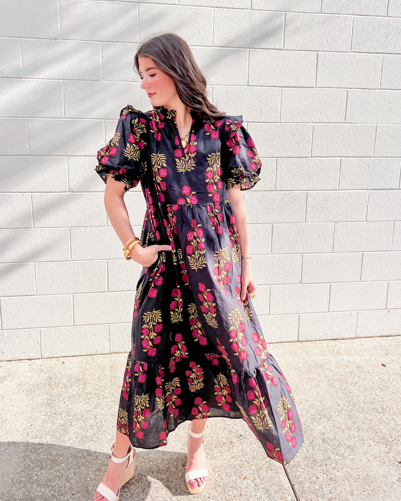 Bring on the romance. This black floral dress blooms with rich berry and olive motifs, dramatic puff sleeves with ruffle shoulders, and a floaty tiered skirt. The split neckline keeps it effortless while side pockets add practicality—equally at home at fall weddings, holiday dinners, or Sunday brunch.