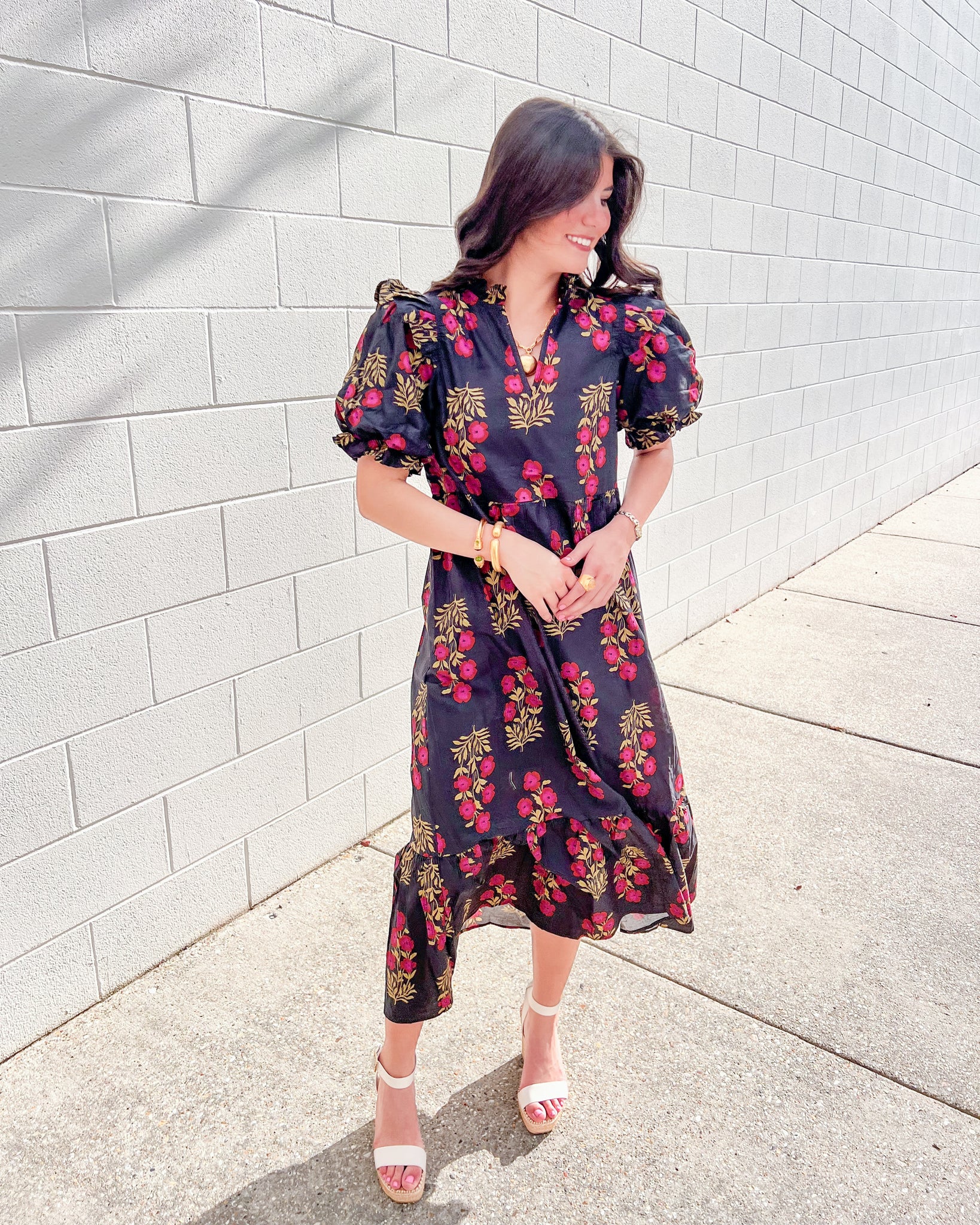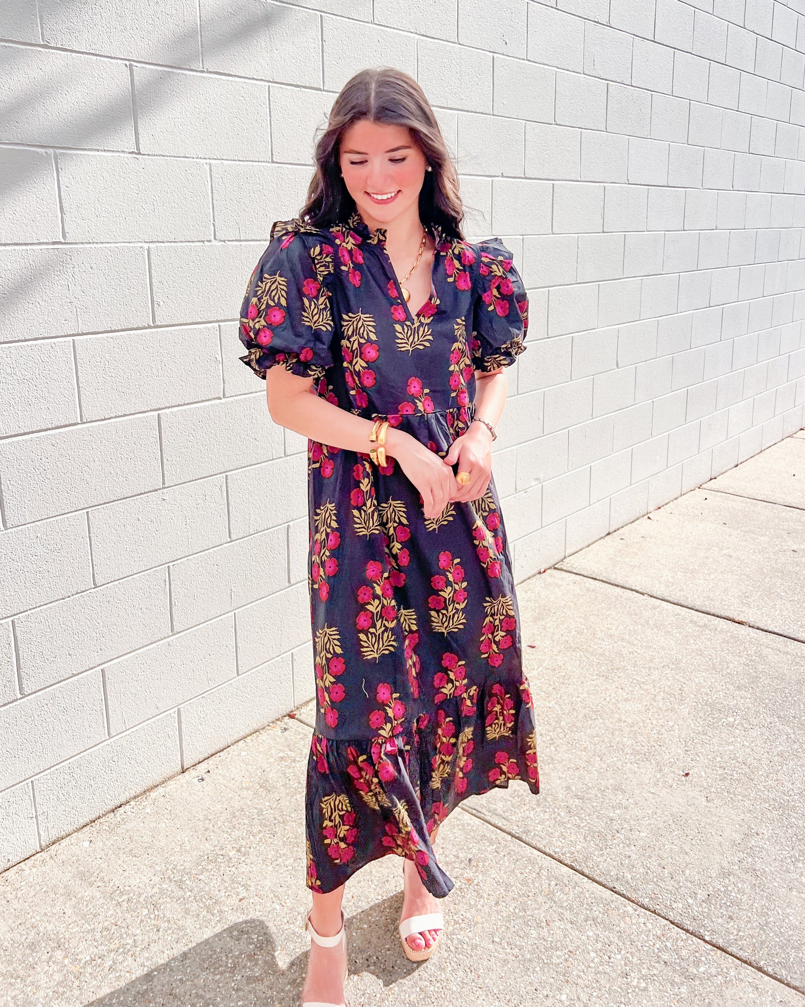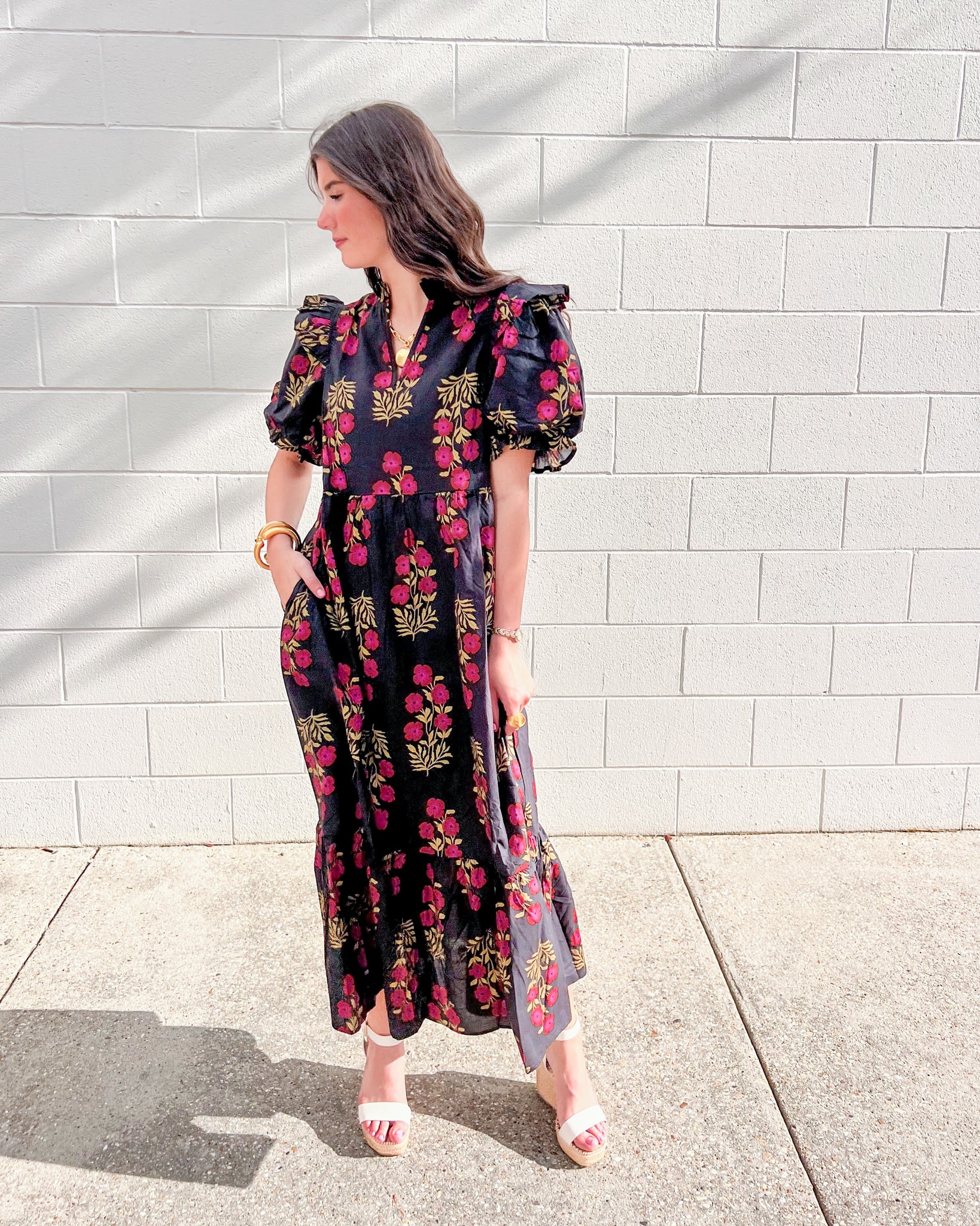 Bring on the romance. This black floral dress blooms with rich berry and olive motifs, dramatic puff sleeves with ruffle shoulders, and a floaty tiered skirt. The split neckline keeps it effortless while side pockets add practicality—equally at home at fall weddings, holiday dinners, or Sunday brunch.