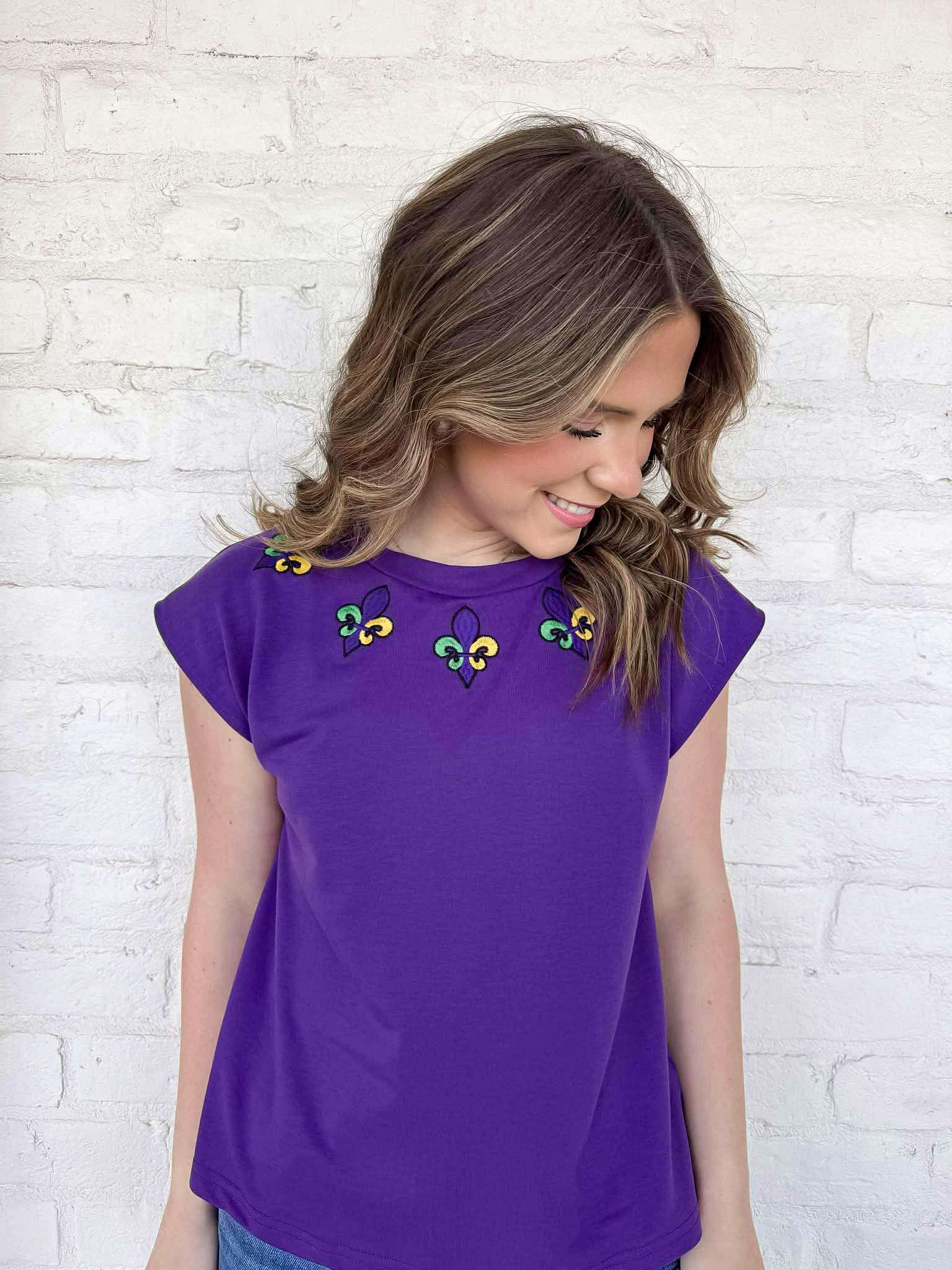 Elevate your festive style with the Fleur De Lis Mardi Gras Collar Sweater Top! Adorned with exquisite embroidery, this top captures the essence of celebration. Feel the vibrant spirit of Mardi Gras envelop you, making every moment special. Wear it to showcase your passion for fun and flair!