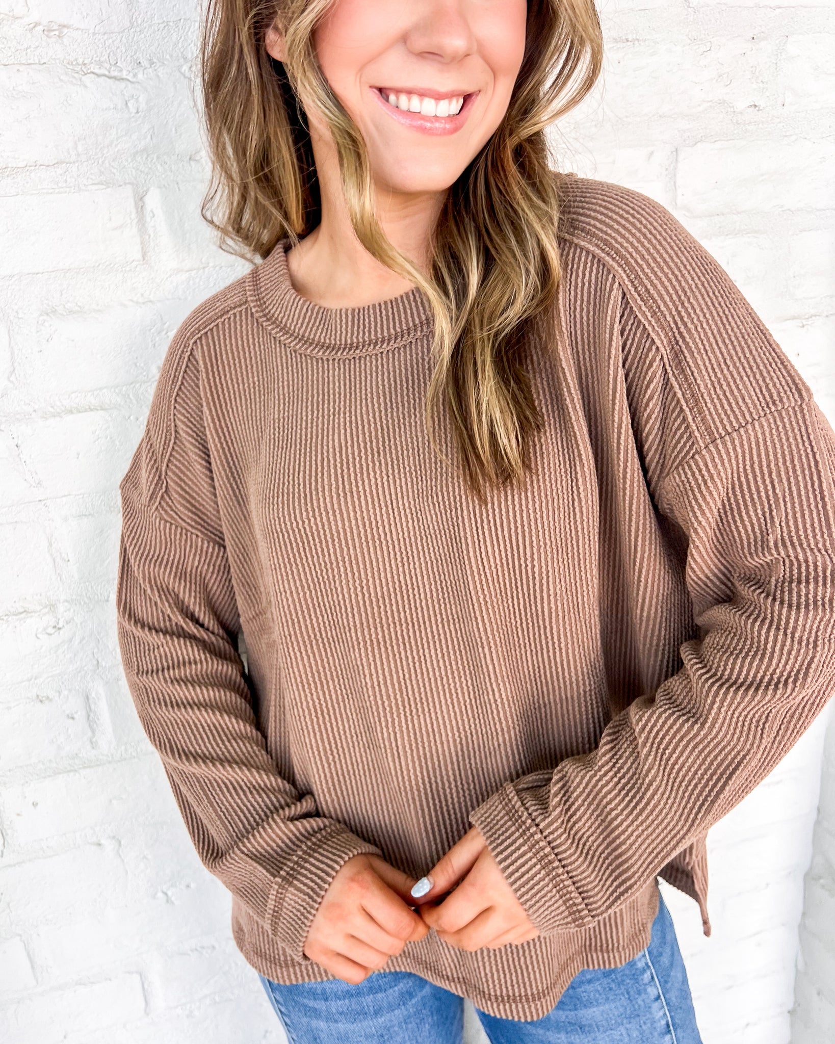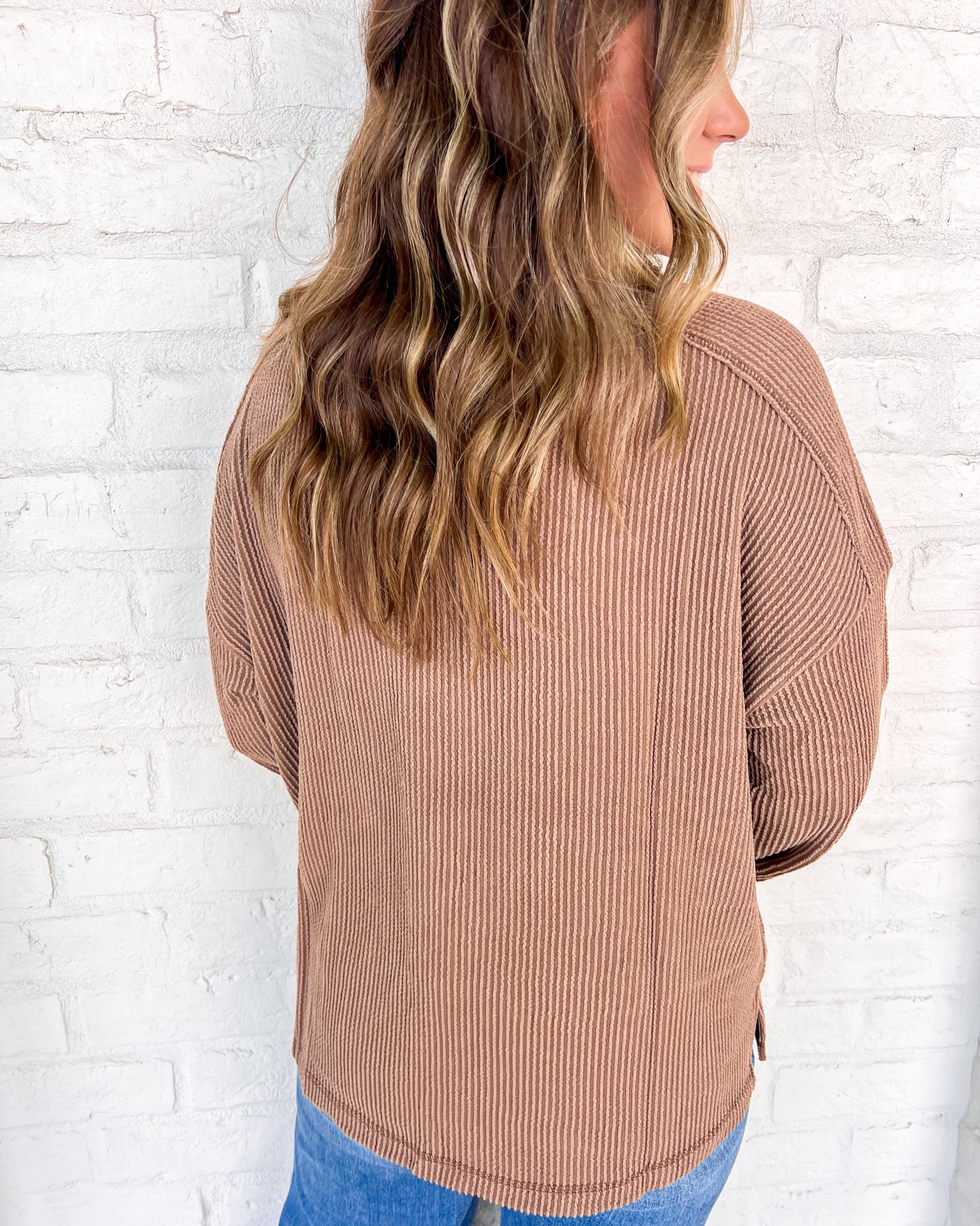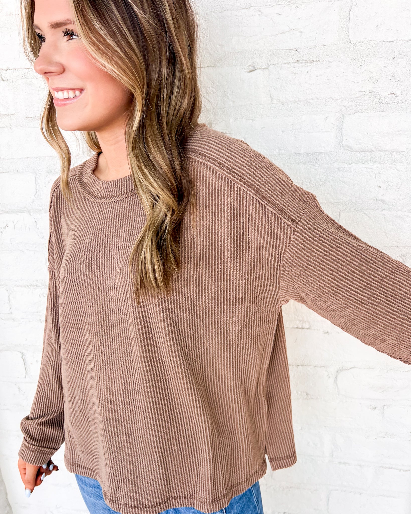 "Experience all-day comfort and style with our Hard Worker Top! This crew neck ribbed long sleeve knit top is the perfect addition to any wardrobe. Stay cozy and polished throughout your day with our versatile top."