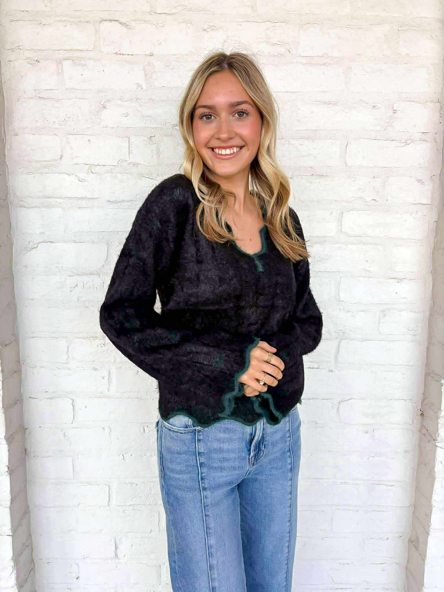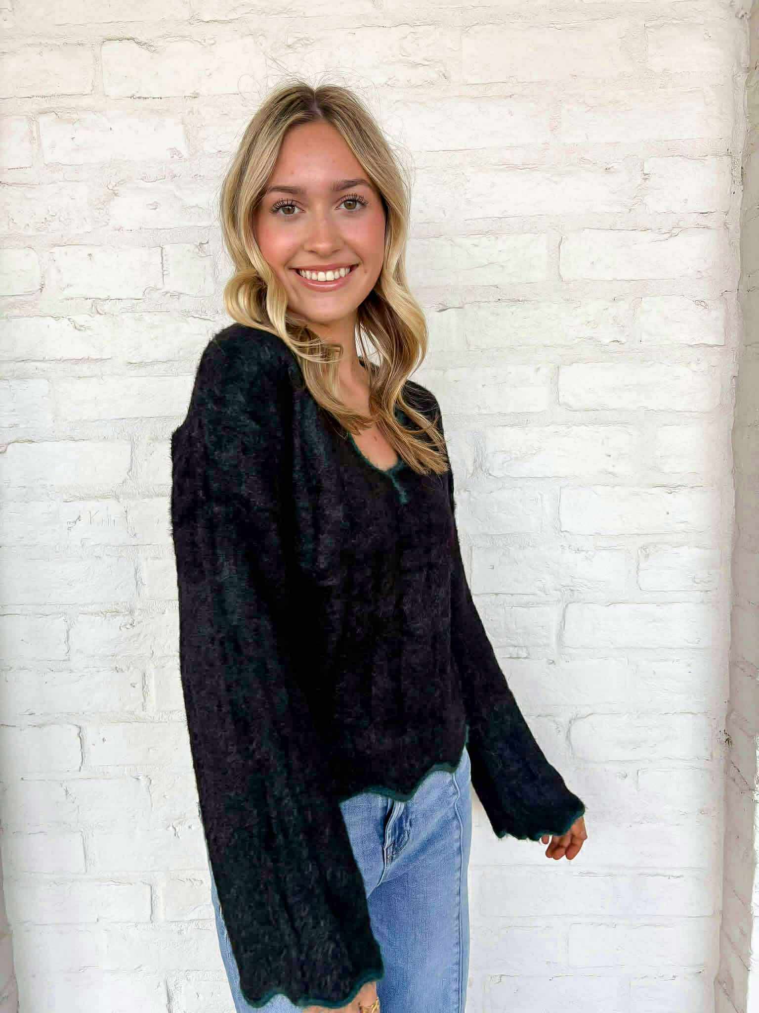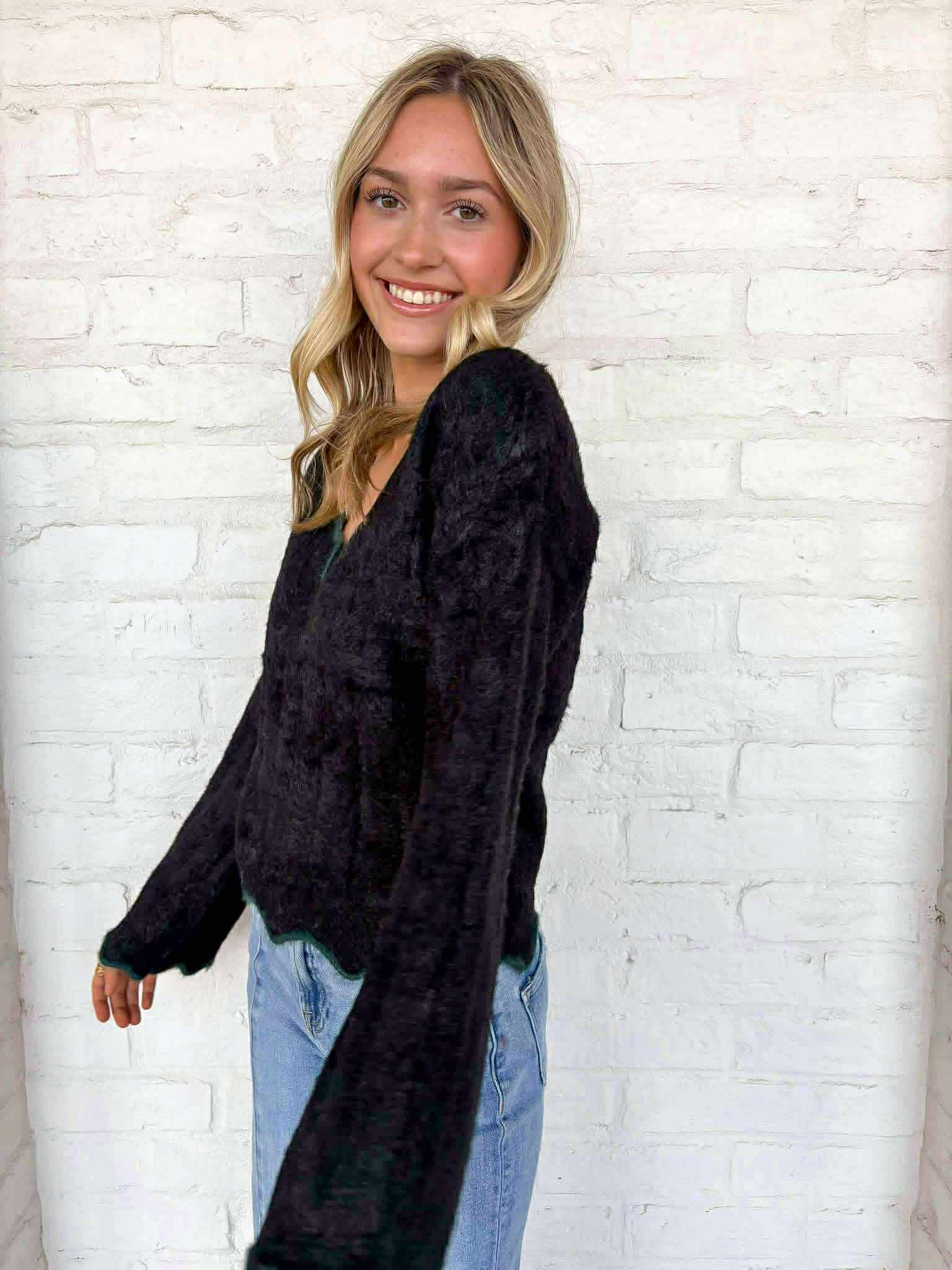 Introducing our Just Say It Black Top! Made with a beautiful scallop design, this top adds the perfect touch of elegance to any outfit. Look and feel confident with this versatile and stylish piece. Make a statement and "Just Say It" with this top!