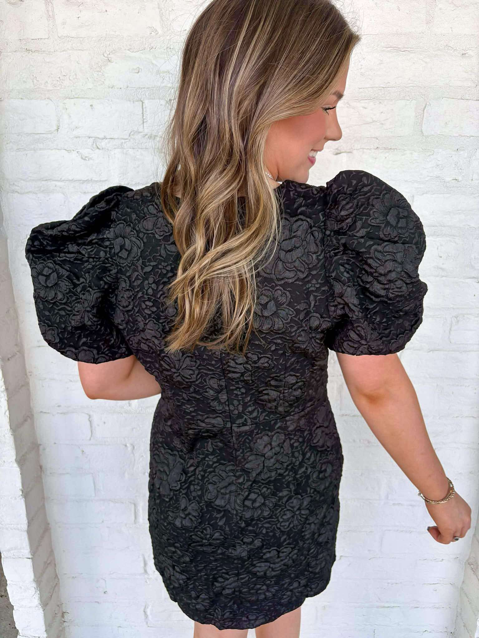 Let the music play and turn heads all night with this stunning black Jacquard dress. With its intricate and unique pattern, you'll feel like a piece of art in motion. The perfect addition to your wardrobe for any special occasion.