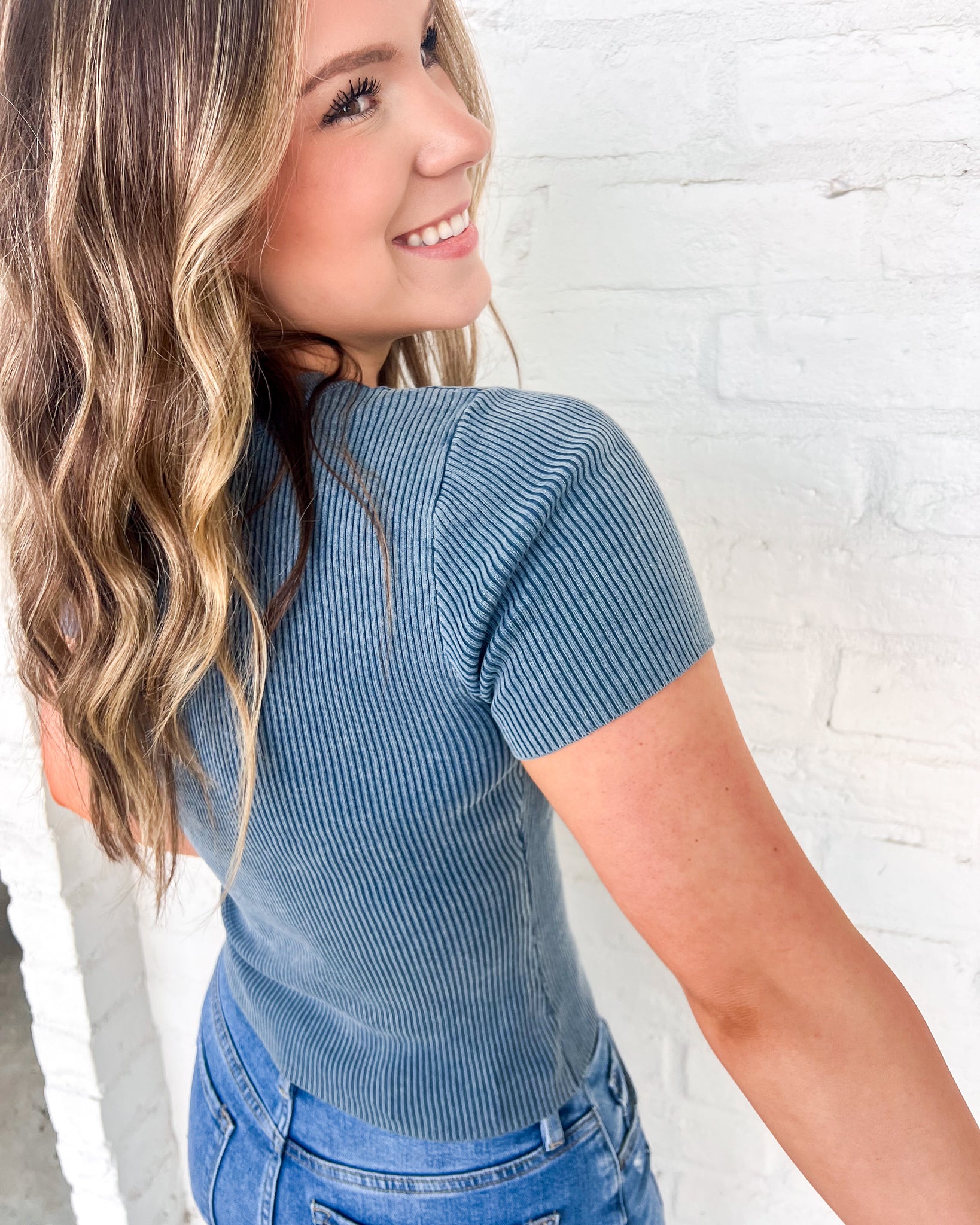 This short sleeve cropped knit tee features a washed ribbed design that adds texture and dimension to your outfit. Perfect for a casual day out or a night on the town, this tee is versatile and effortlessly stylish. Comfortable and chic, it's a must-have addition to any wardrobe.