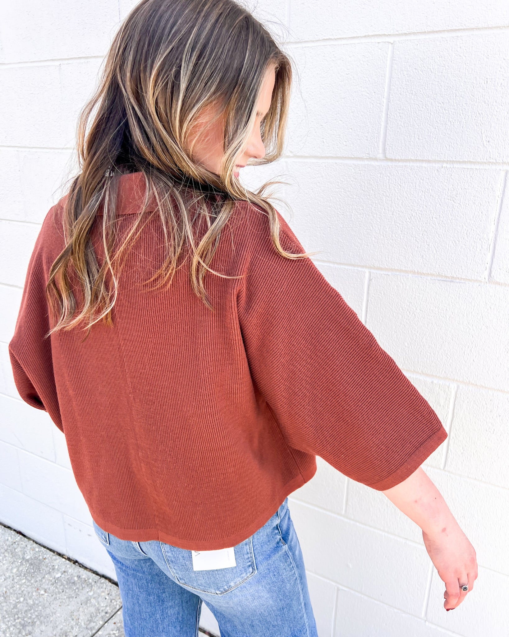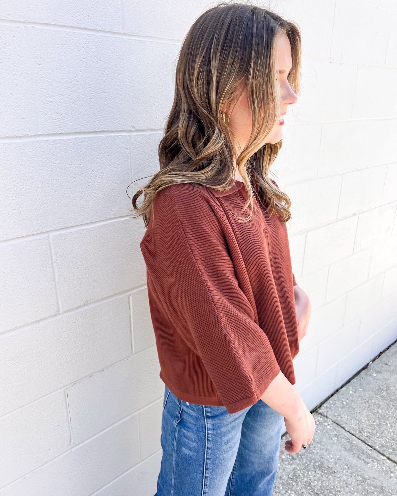 Effortless style meets everyday comfort in this Rust Textured Knit Split Neck Top. Designed with a relaxed silhouette, this versatile piece features a soft ribbed knit, drop shoulders, and a flattering split neckline that elevates a casual staple. The warm rust shade makes it perfect for fall layering and pairs seamlessly with denim, skirts, or trousers for an easy, put-together look.