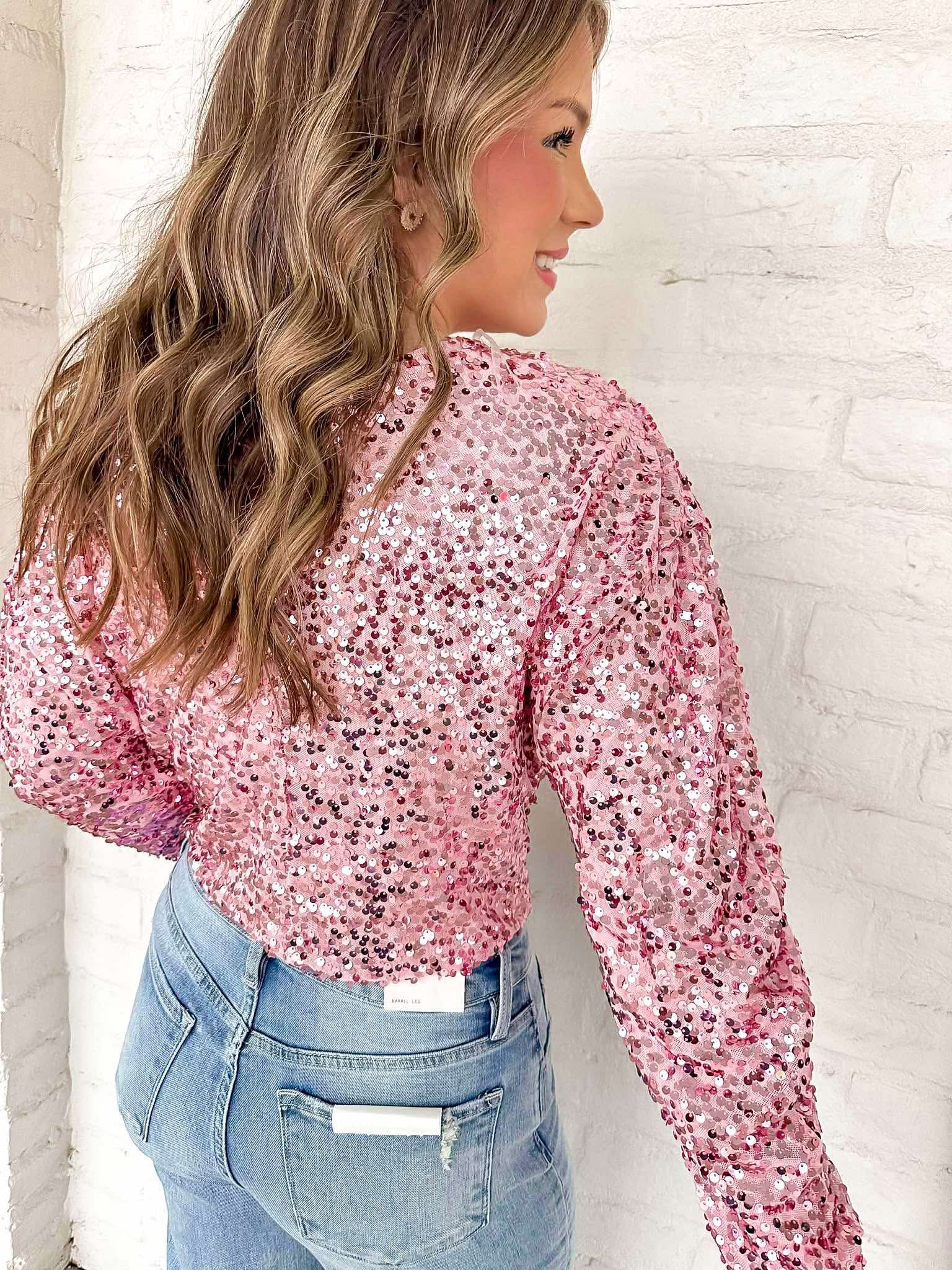 Welcome the new year in style with our stunning pink tops, featuring a glitter glam design. Effortlessly sparkle and shine at any party or event. Elevate your wardrobe and make a fashion statement with this must-have top.