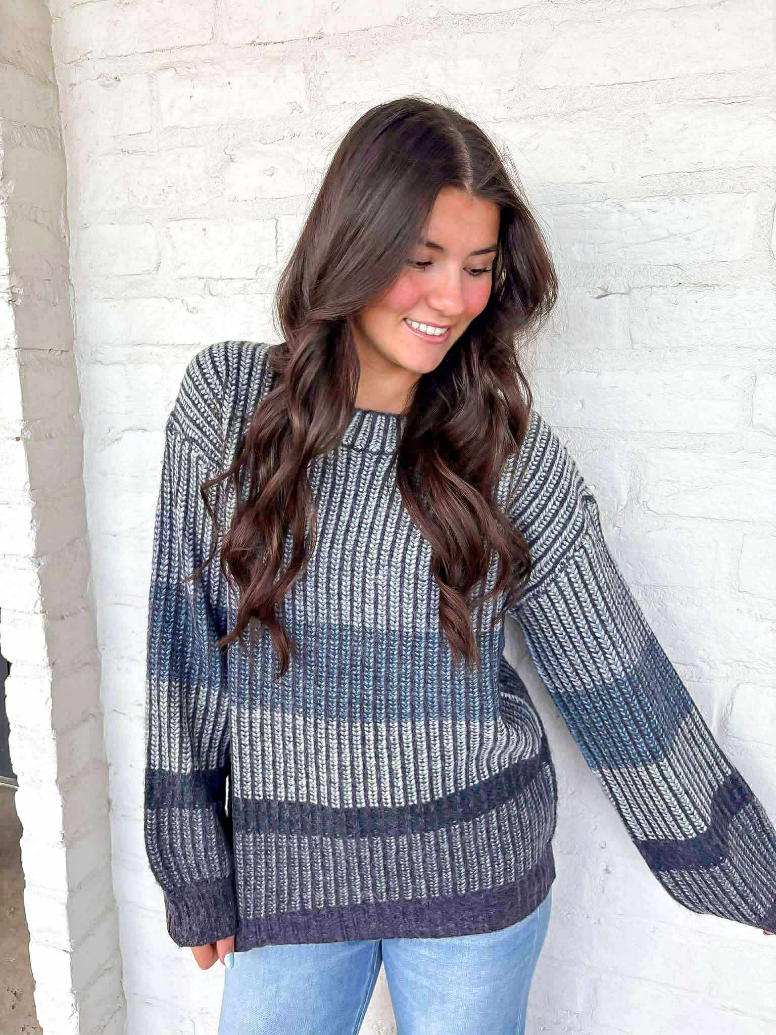 This On The Block Navy Sweater is the perfect blend of style and comfort. With its navy stripe design, it adds a touch of sophistication to any outfit. Stay warm and stylish this season with this must-have sweater.