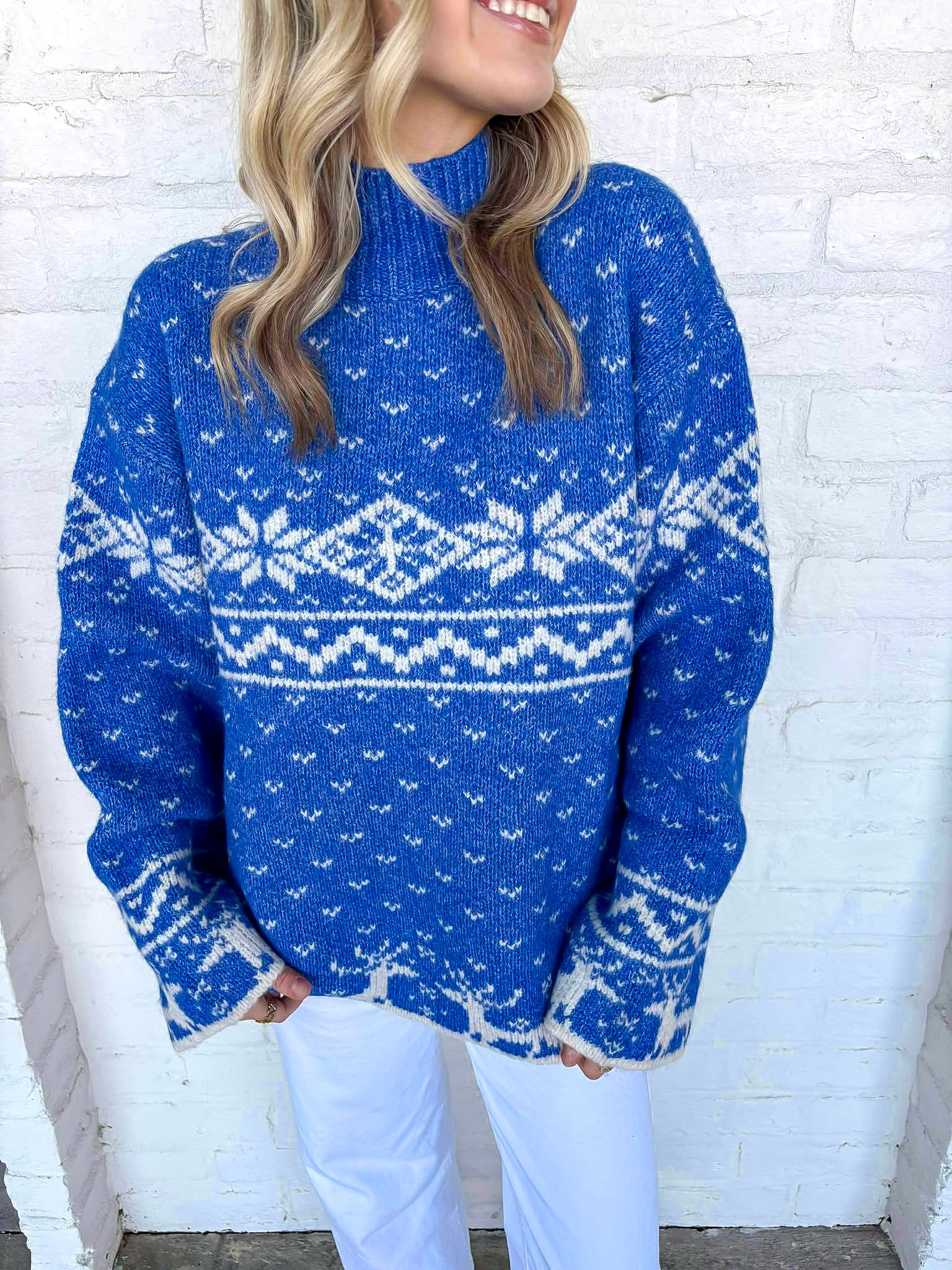 "Wrap yourself in comfort and style with our On The Bright Side Blue Sweater. Made from the softest material, this sweater is perfect for cozy winter nights or chilly days. With its vibrant blue color, you'll brighten up any outfit and your spirits. Stay warm and fashionable with this must-have piece!"