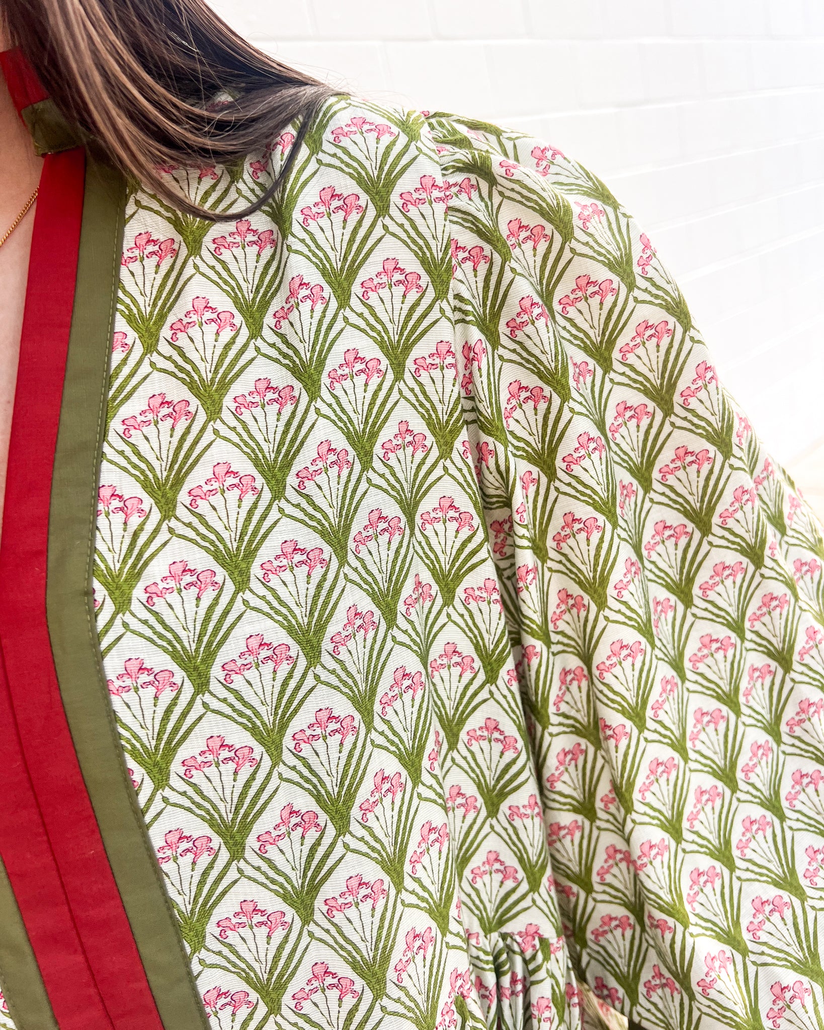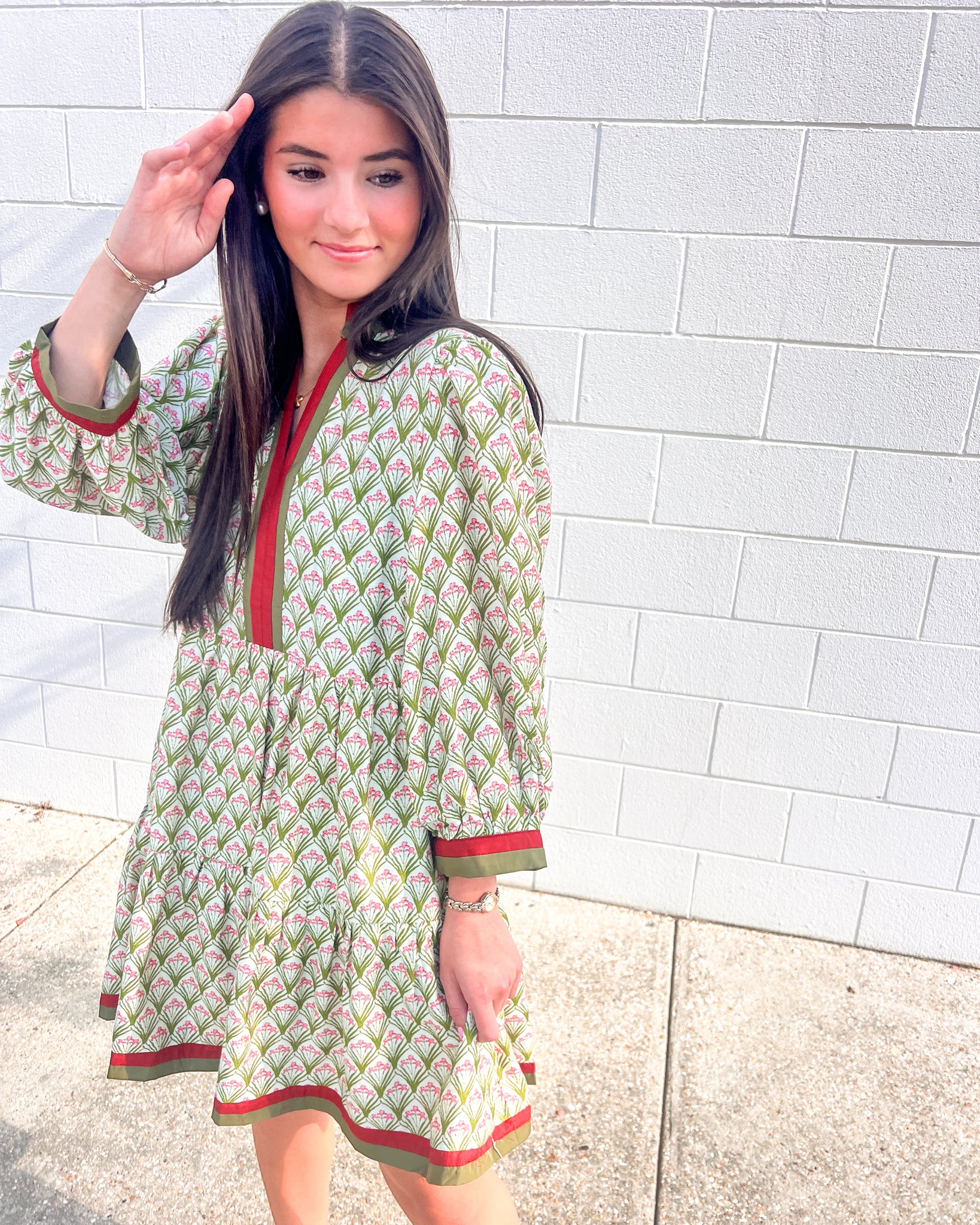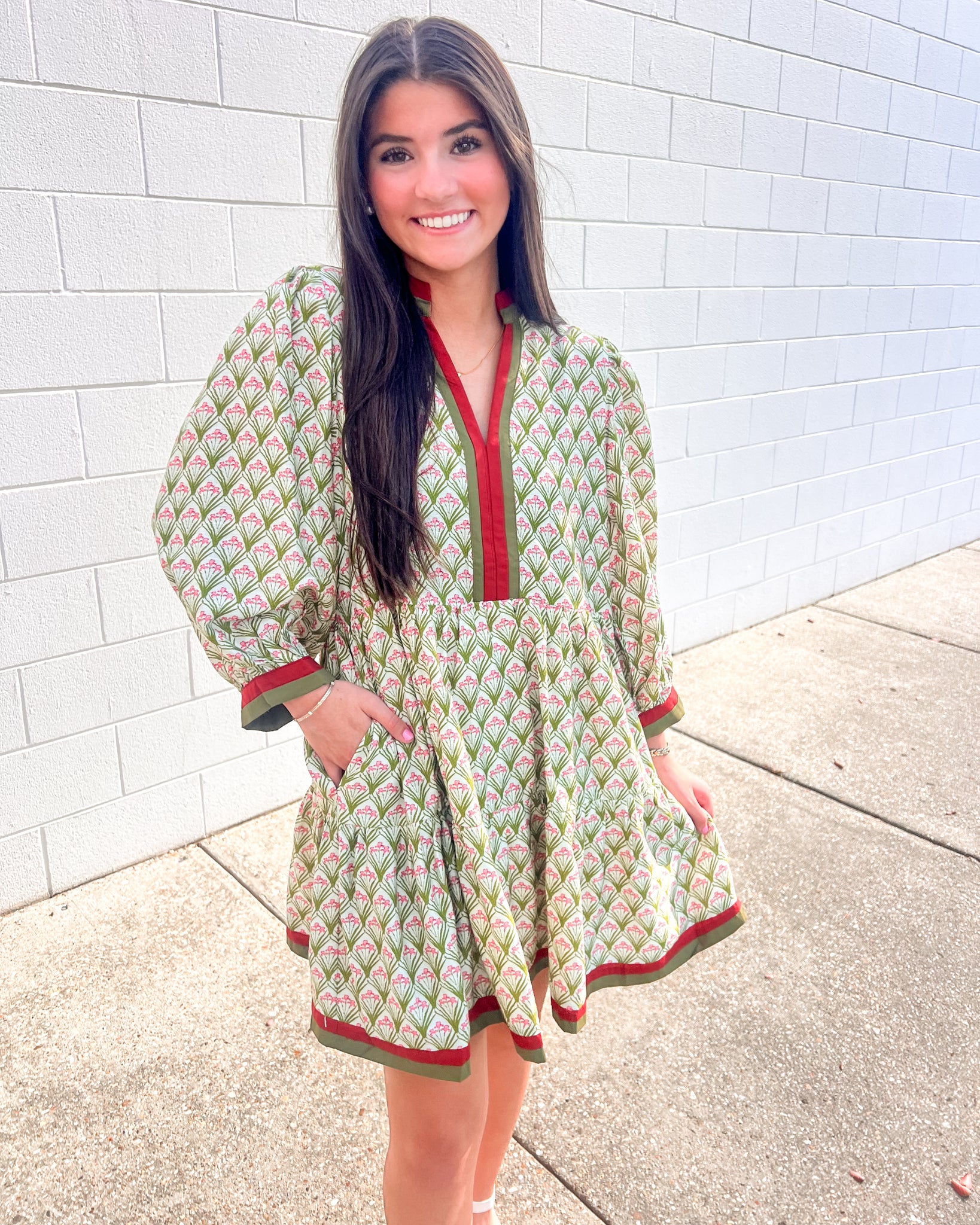 Playful yet polished, the Green & Red Print Long Sleeve Mini Dress is a chic statement piece for your wardrobe. Designed with a bold geometric-inspired print, this dress features contrast trim along the neckline, cuffs, and hem for a striking finish. The relaxed fit, tiered skirt, and side pockets make it as comfortable as it is stylish—perfect for all-day wear.