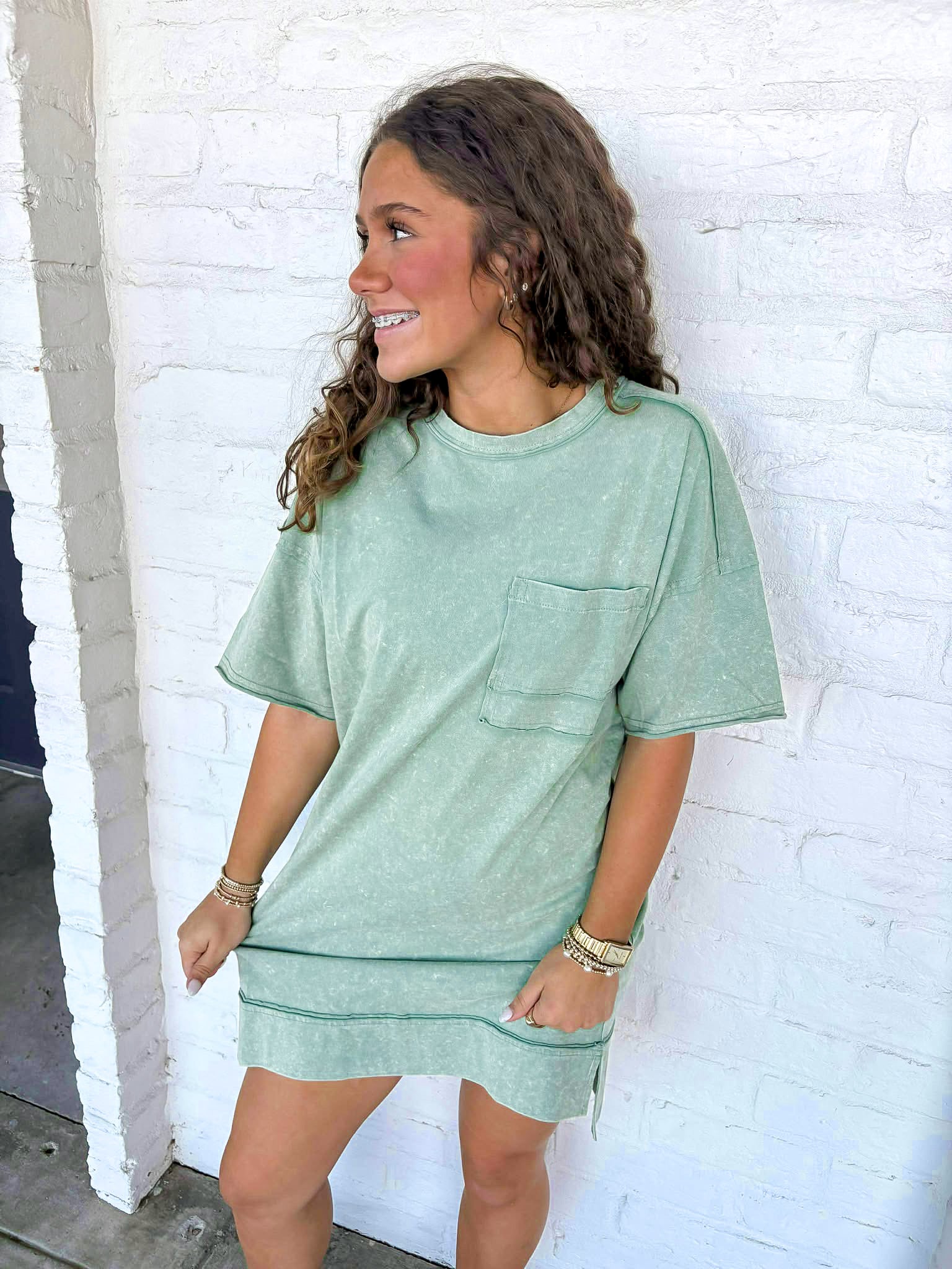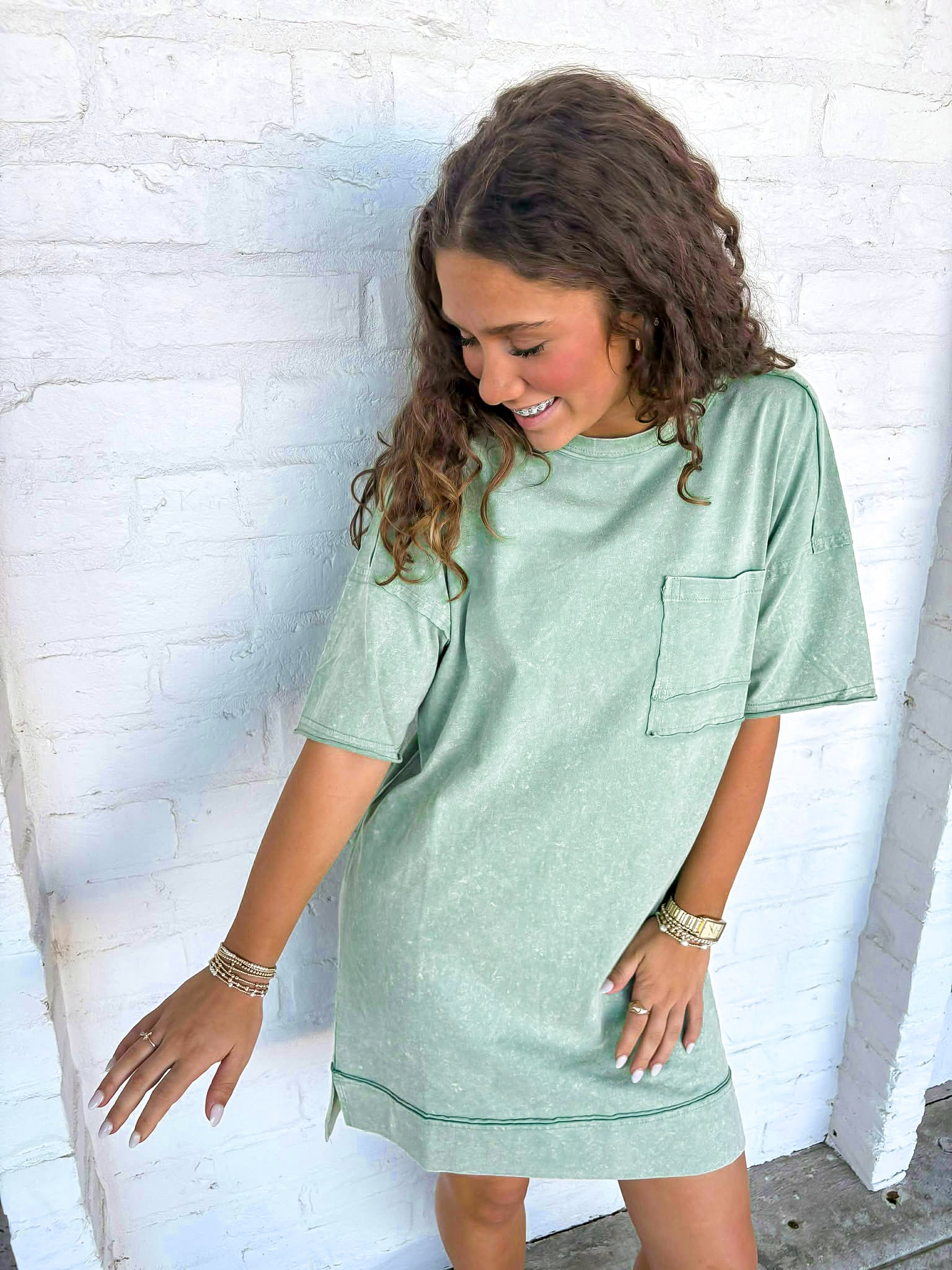 Looking for comfort and style? Look no further than our On The Roll Sage Dress! This tshirt dress offers the best of both worlds with its effortless, casual design and soft fabric. Perfect for any occasion, this dress will keep you feeling comfortable and looking chic all day long. Get ready to roll in style with this must-have piece!