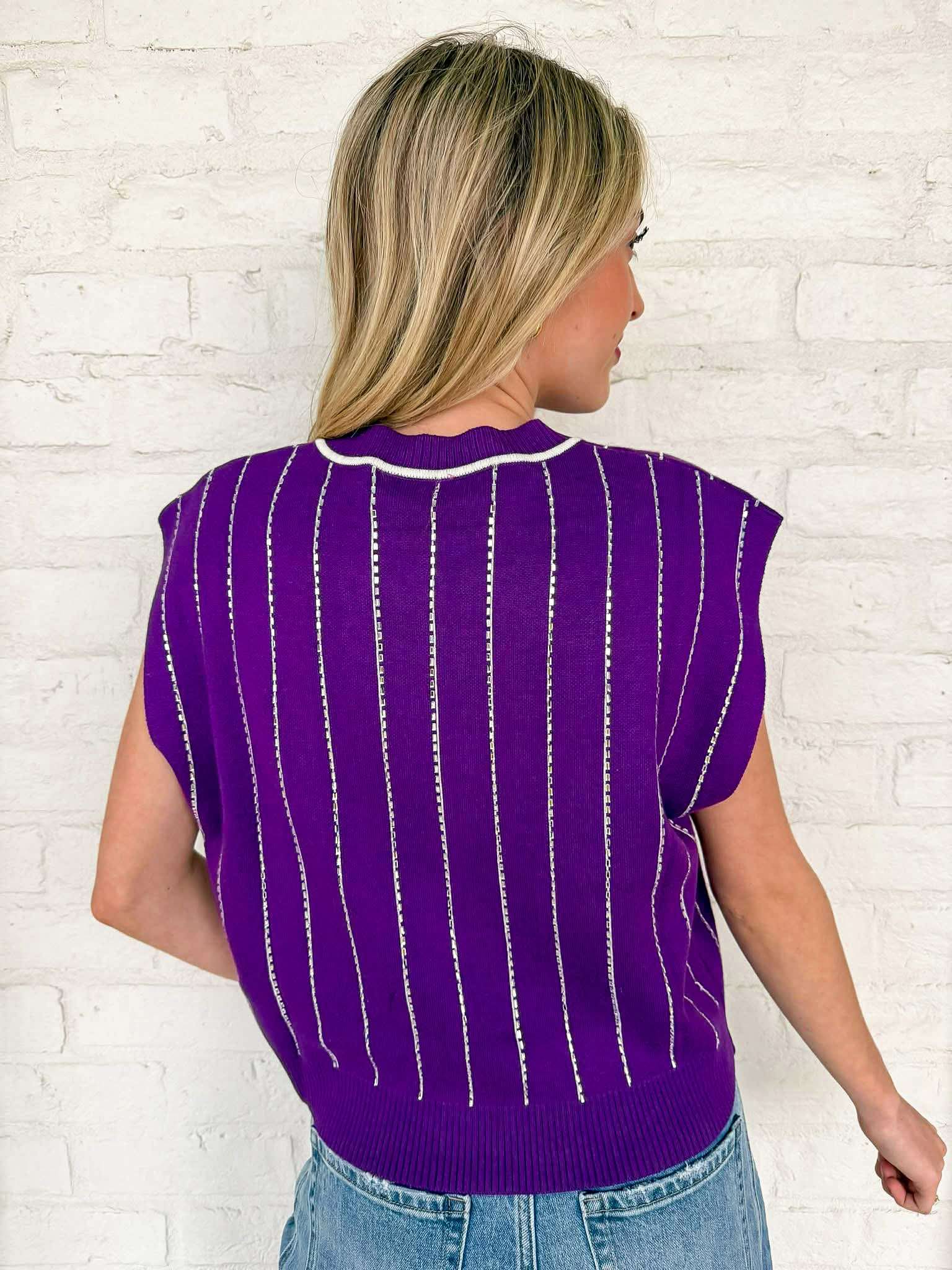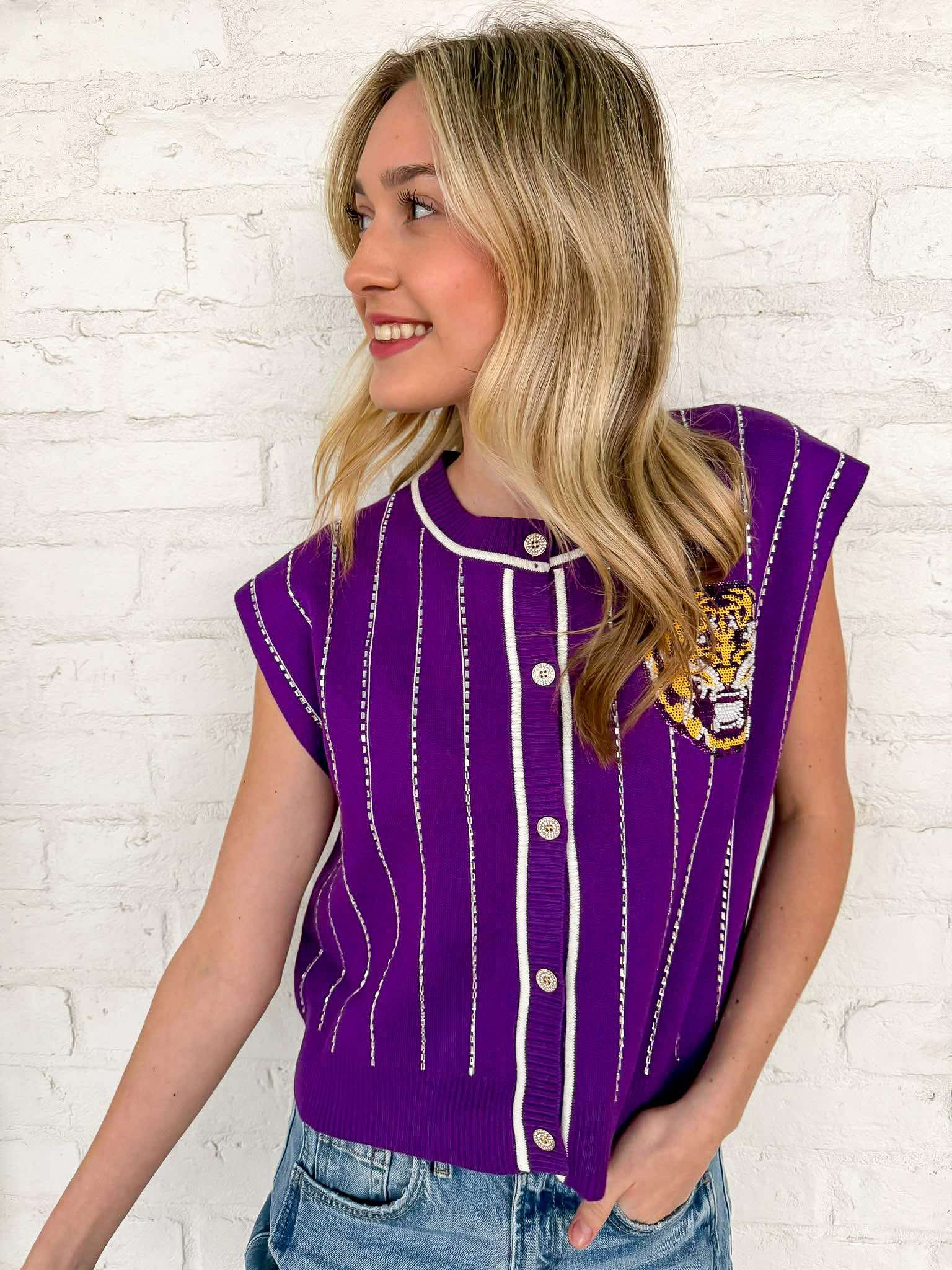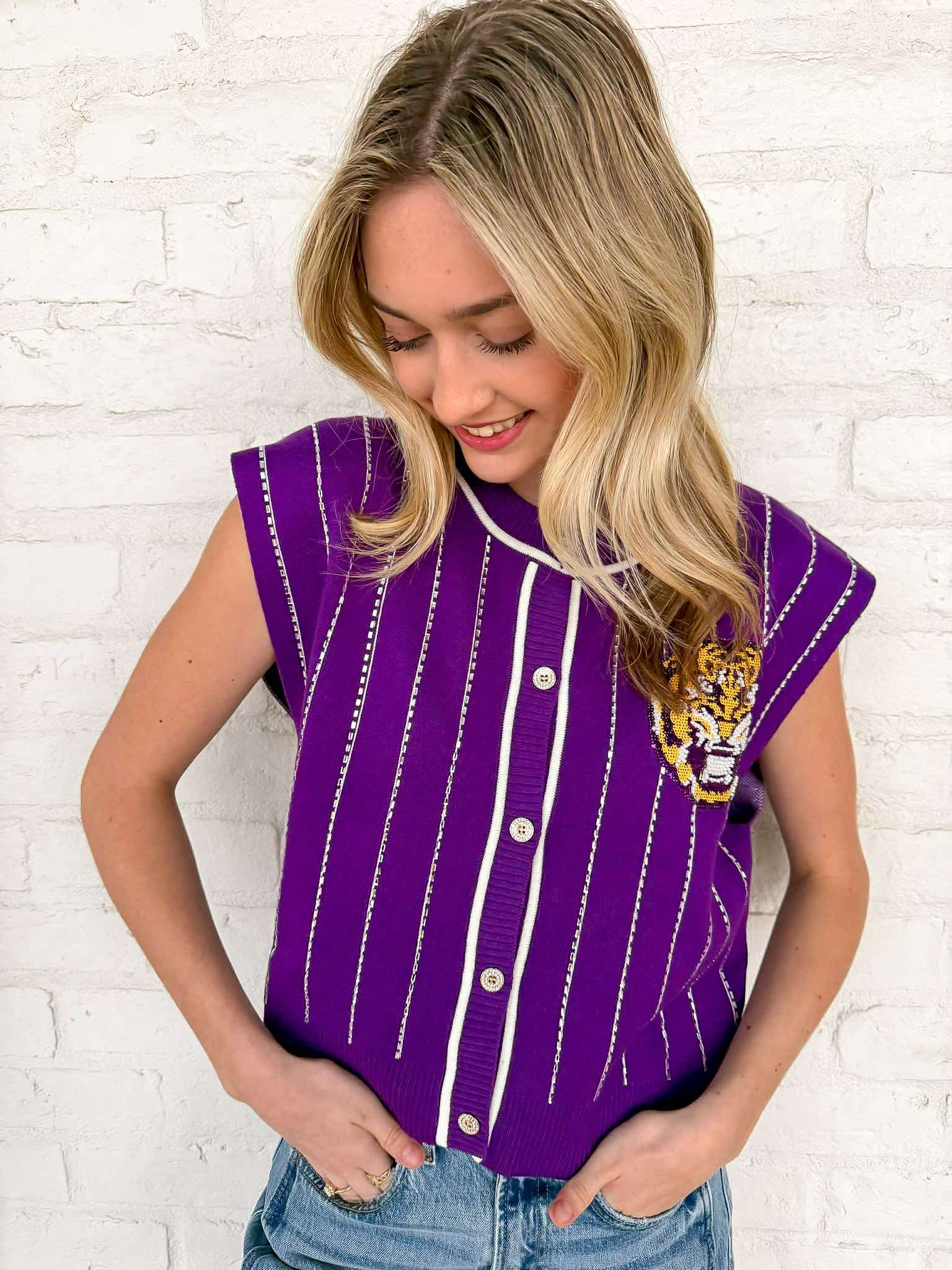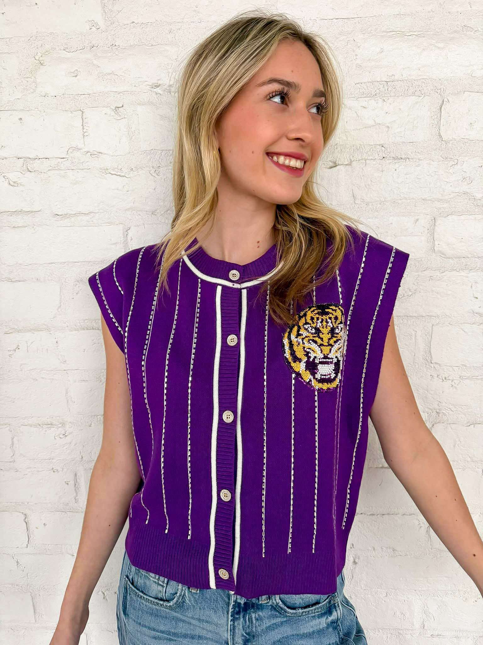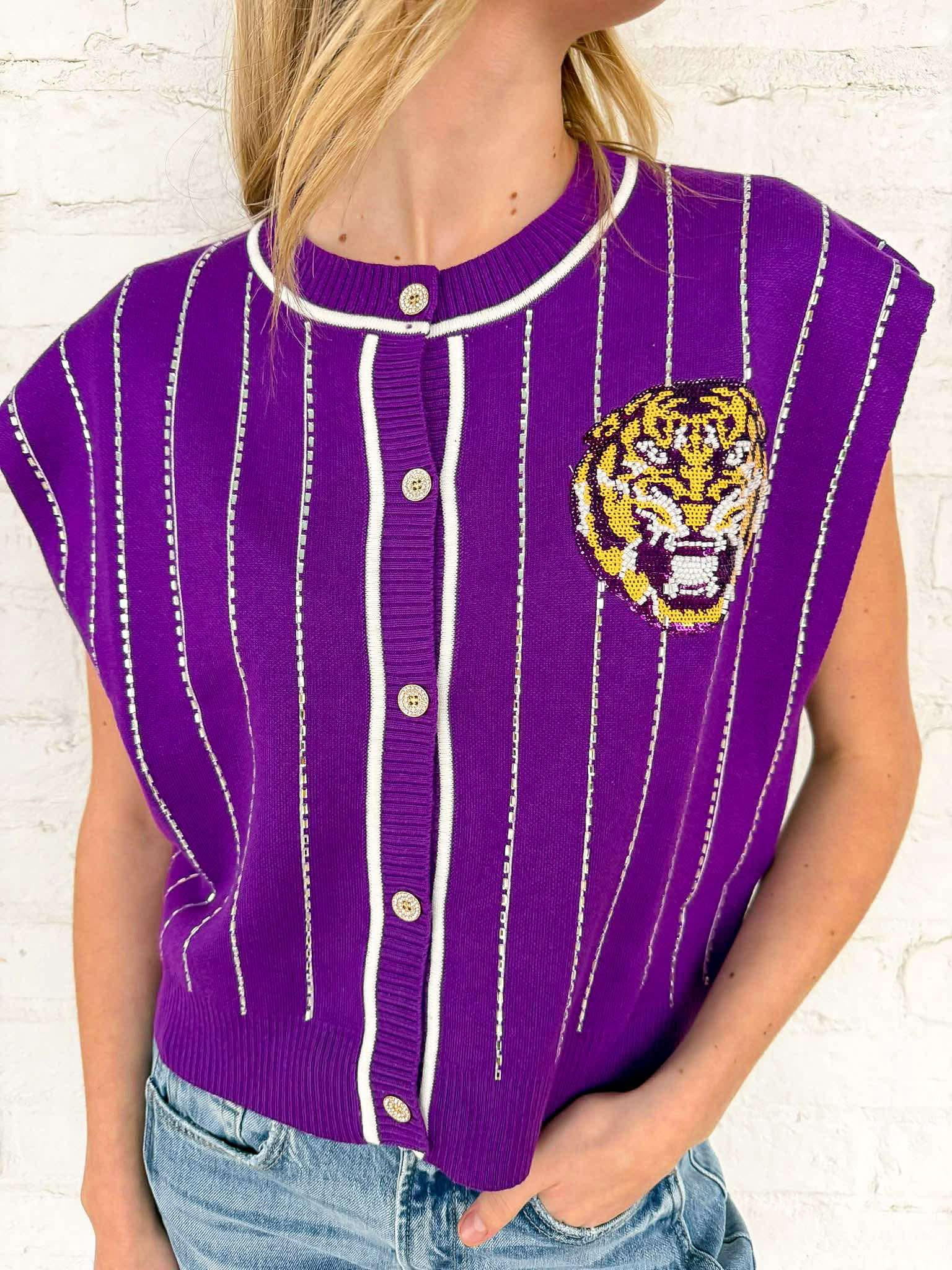 Elevate your game day style with the Queen Of Sparkles Purple LSU Striped Mascot Button Down Vest! This vibrant vest showcases your team spirit while keeping you effortlessly chic. Its striking design ensures you stand out in the crowd, making every moment a celebration of LSU pride! Perfect for fans who want to shine!
