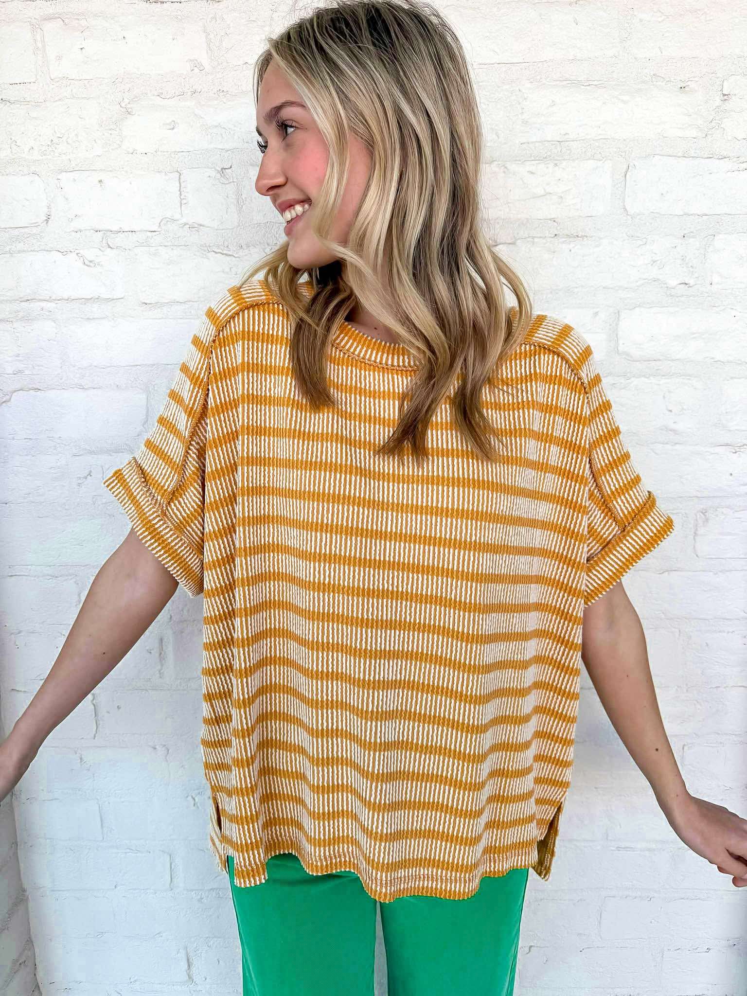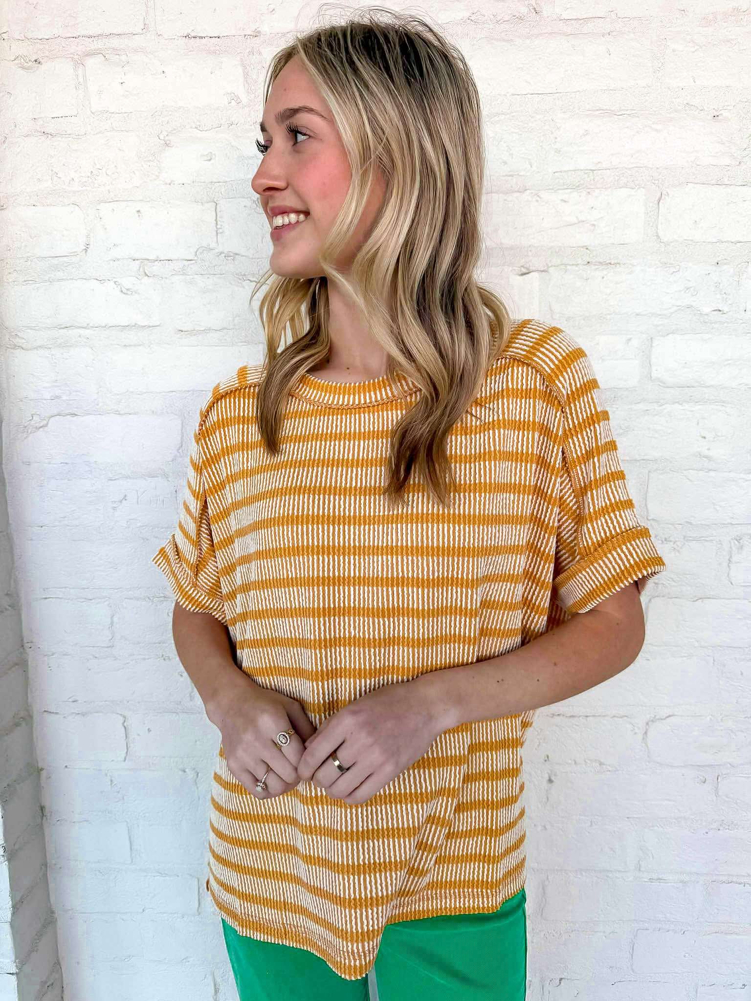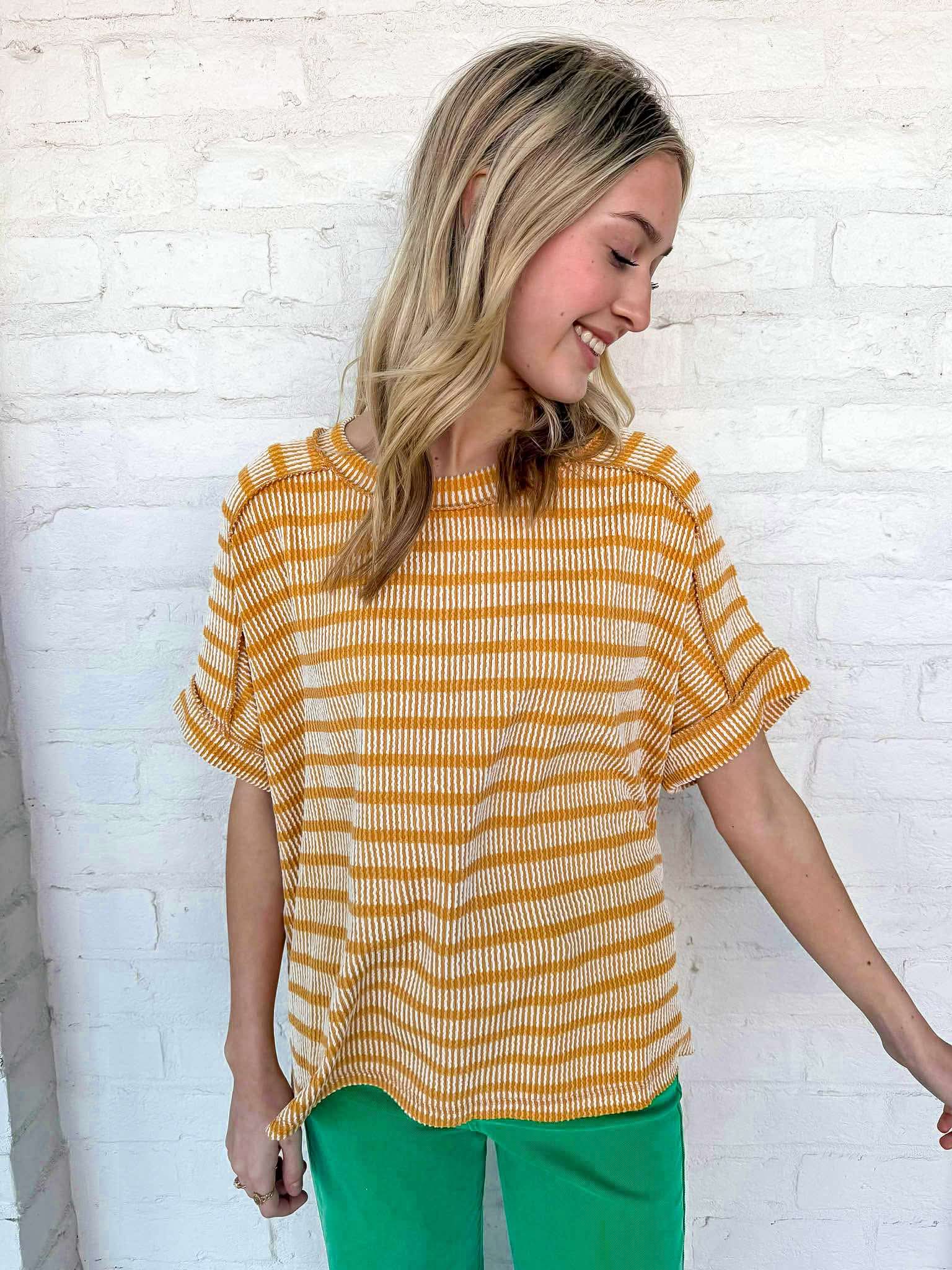 Elevate your wardrobe with the See You Again Top! Its unique raised rib stripes and exposed seam design make it a striking choice for any occasion. This top not only adds a touch of flair but also offers comfort, inspiring confidence in every step you take. Embrace your style!