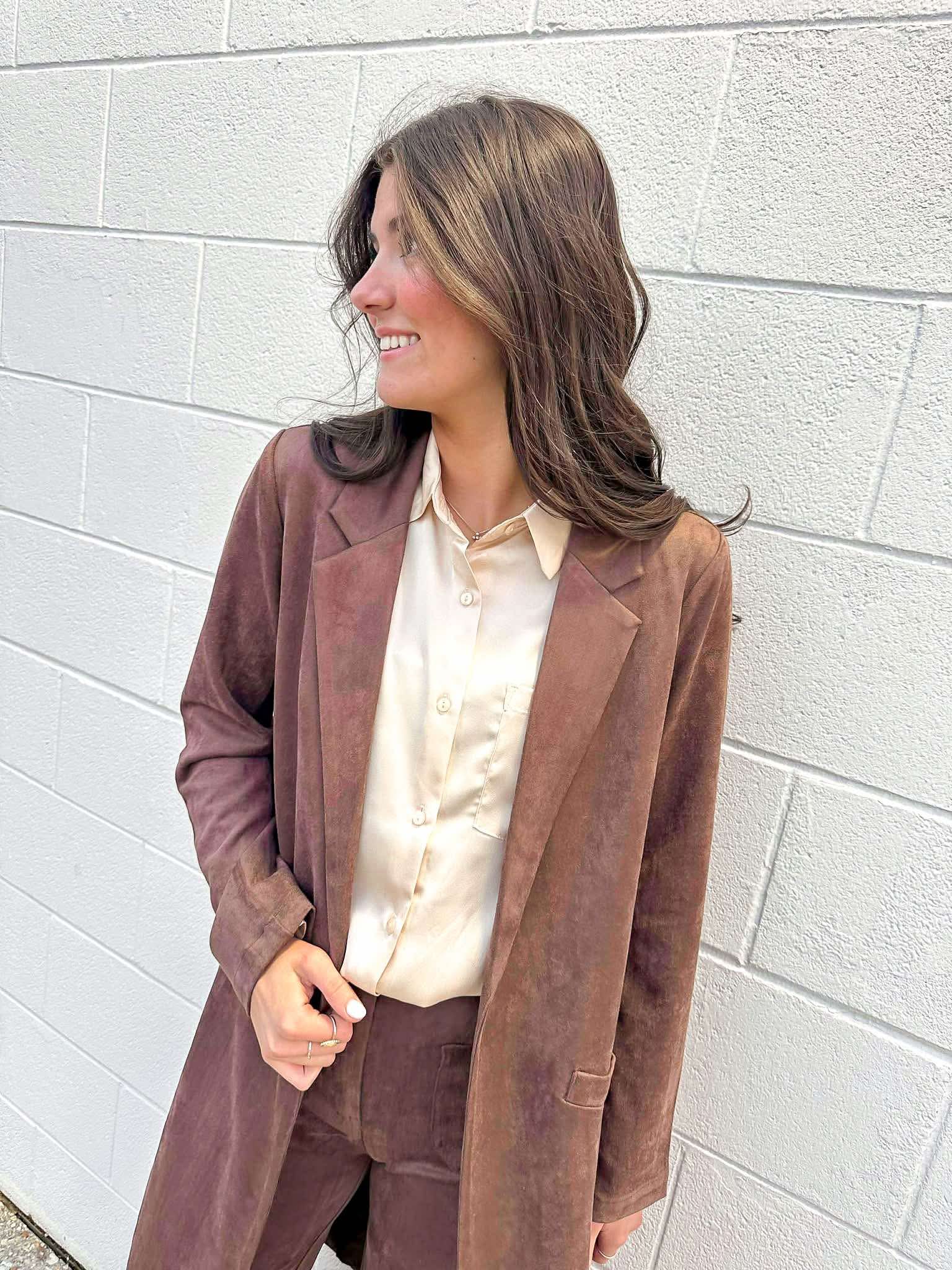 Discover a new level of luxury with the Tell Me More Brown Coat. Made from high-quality suede, this coat is not only incredibly soft and stylish, but also offers unbeatable comfort and warmth. Elevate any outfit and feel confident in your fashion choices with this must-have addition to your wardrobe!