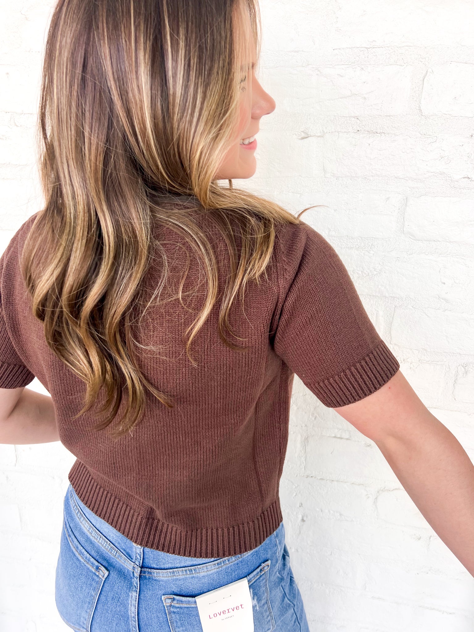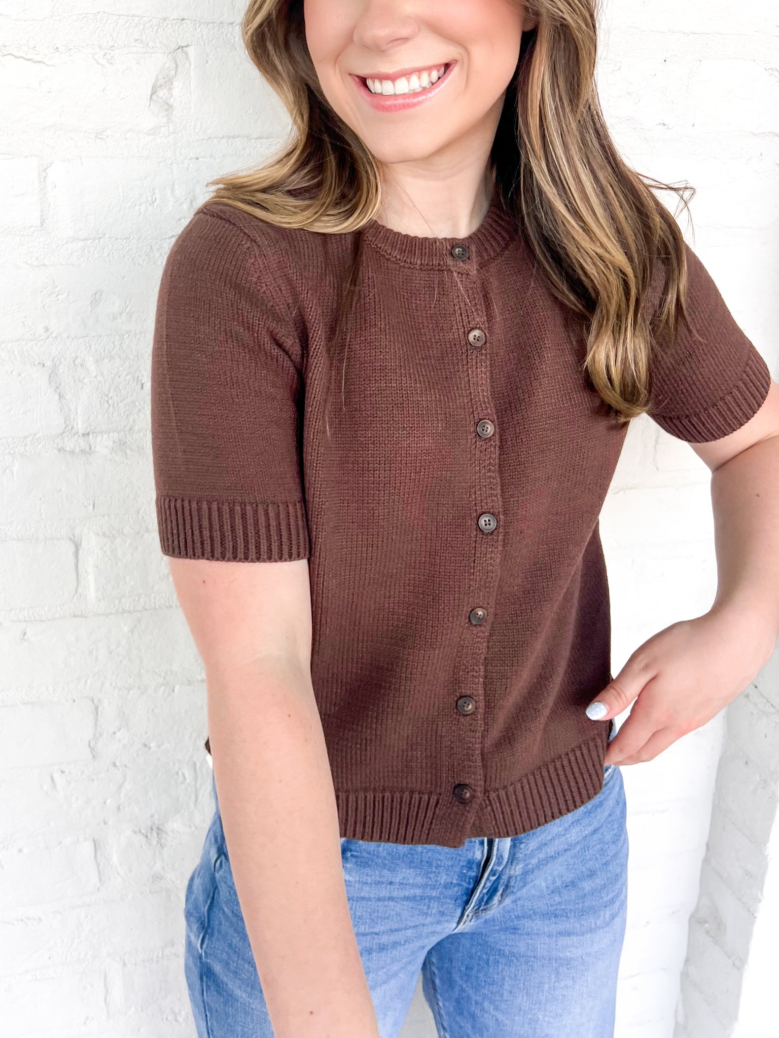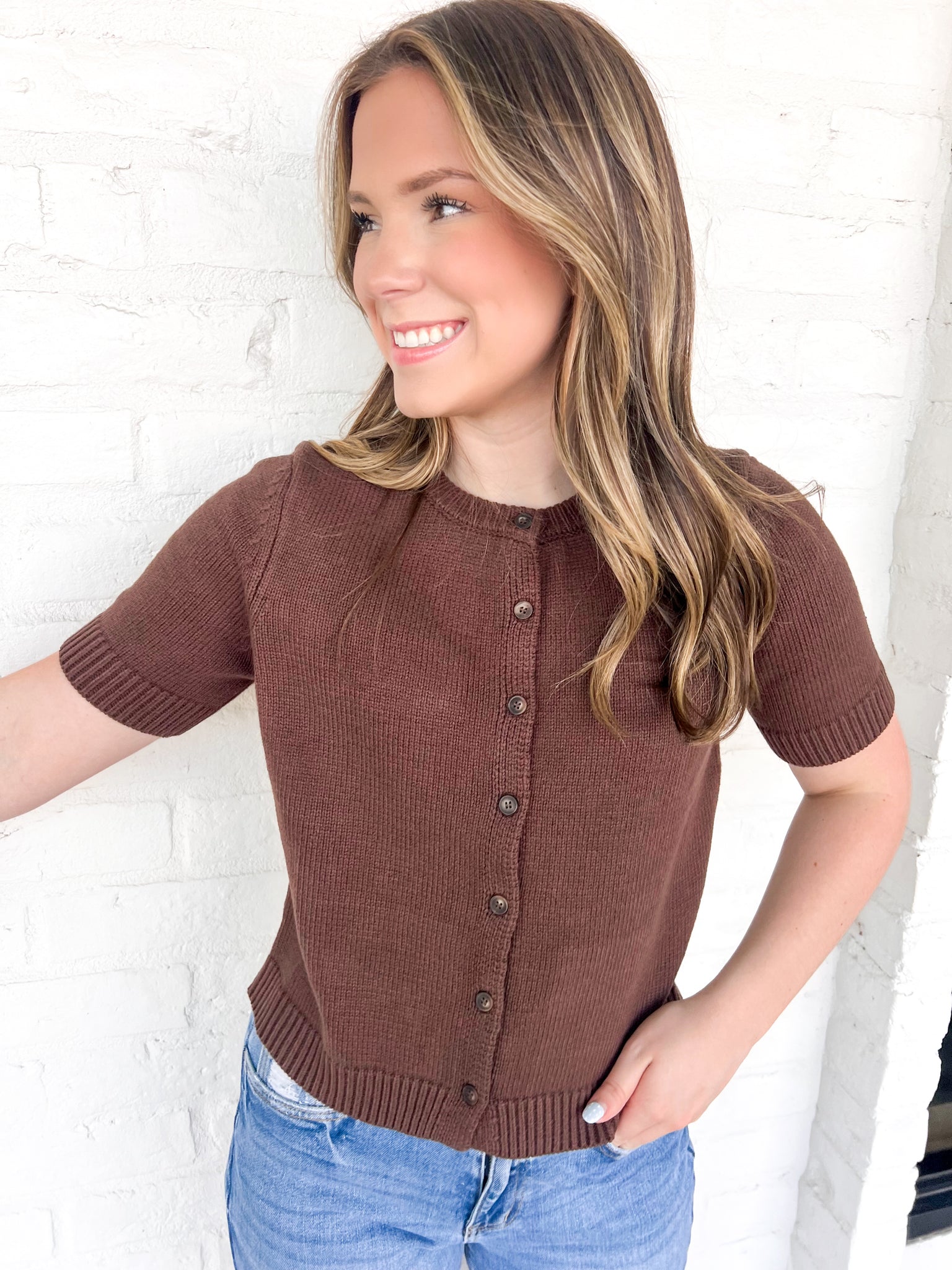 Stay comfortable and stylish with our Turning Pages Top! This short sleeve button down knit cardigan sweater is the perfect addition to any outfit. Keep warm while looking effortlessly chic. Say goodbye to boring sweaters and hello to fashion-forward comfort.
