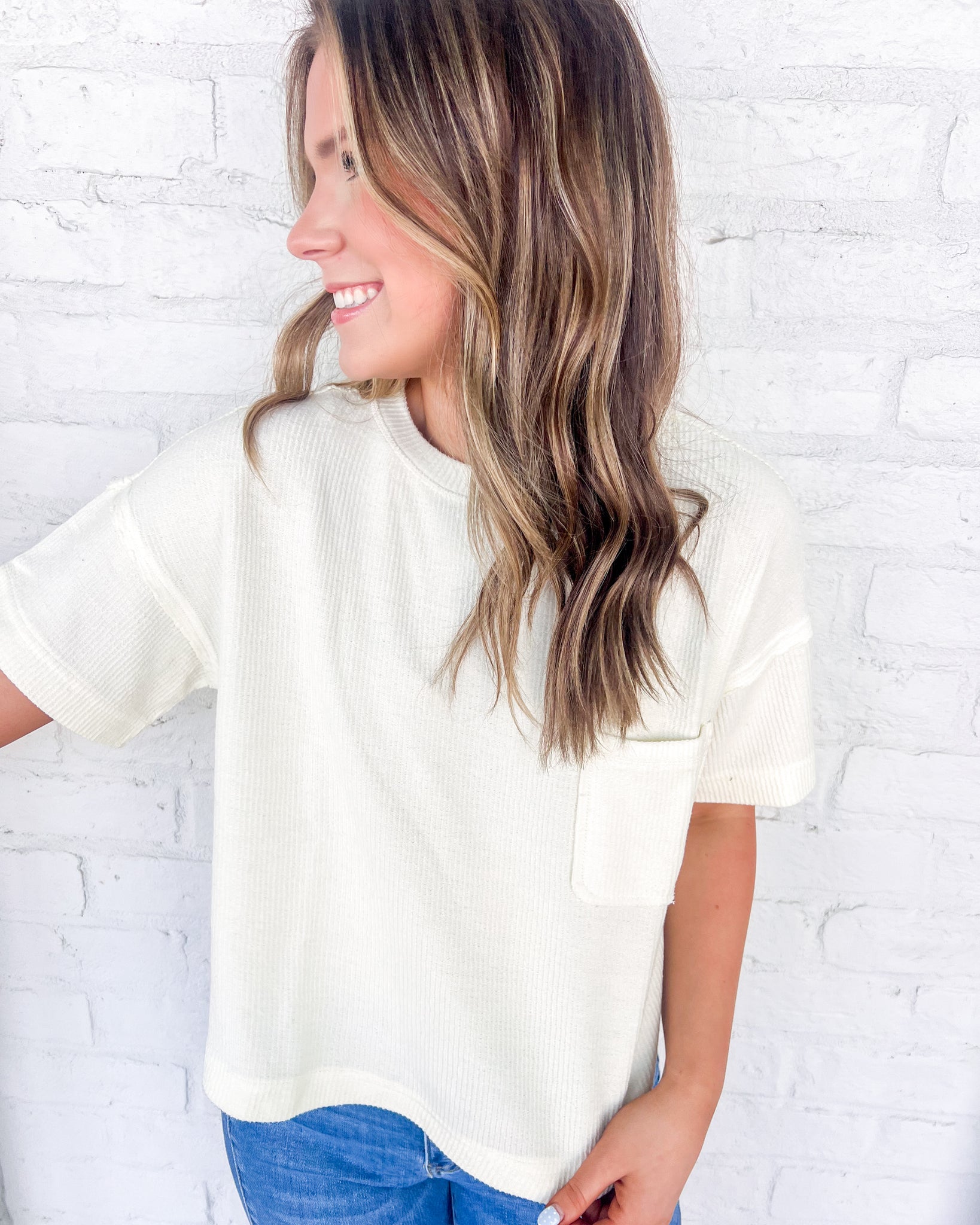 "Experience ultimate comfort and style with our "Wanting To Stay Top" washed rib, short sleeve tee. The soft fabric and convenient pocket make this a must-have for any wardrobe. Stay fashionably on top with our top-quality shirt!"